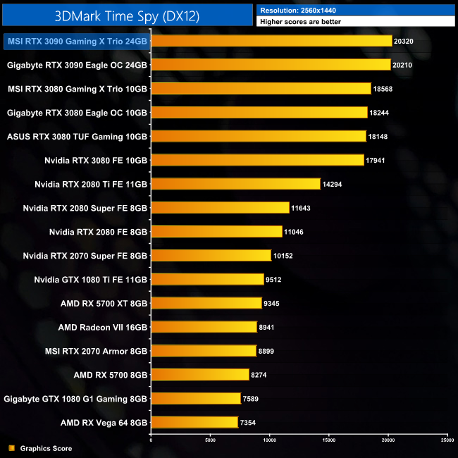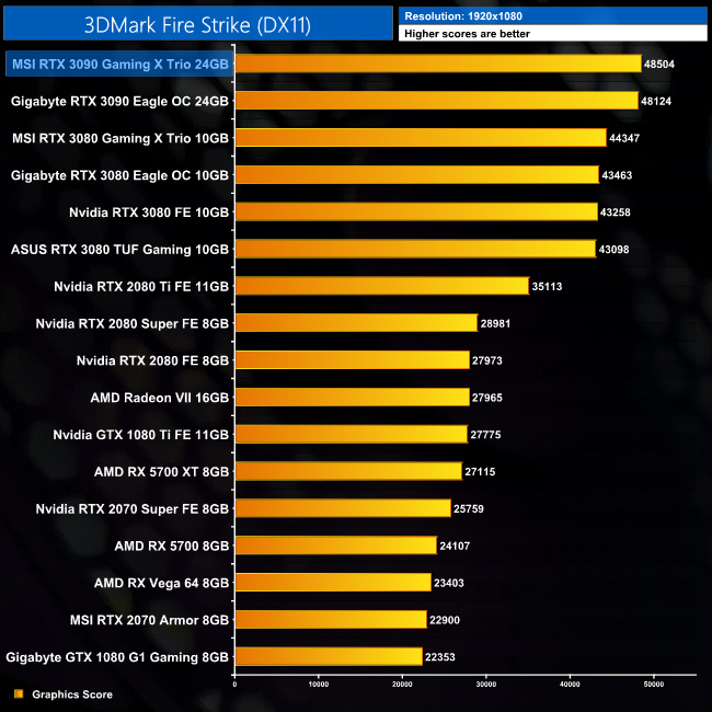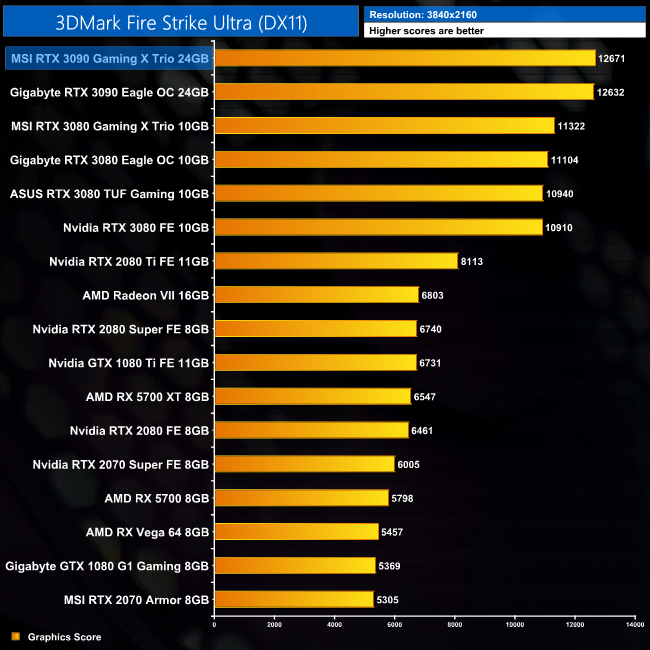 MSI's RTX 3090 Gaming X Trio takes top spot in every 3DMark benchmark we ran. Its best result, relatively speaking, comes in 3DMark Fire Strike Ultra, where it is 16% faster than the RTX 3080 Founders Edition and 56% faster than the RTX 2080 Ti.