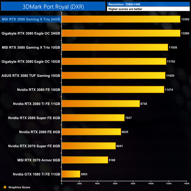 It's the same story for Port Royal, 3DMark's ray tracing benchmark – here we see the RTX 3090 Gaming X Trio come in 16% faster than the 3080 Founders Edition.