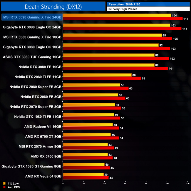 Hideo Kojima's Death Stranding is next, with RTX 3090 pushing well over 100FPS here. For the MSI Gaming X Trio, it's 14% faster than the RTX 3080 Founders Edition, and 53% faster than the RTX 2080 Ti.