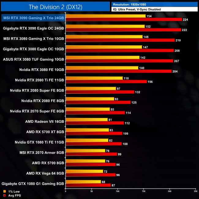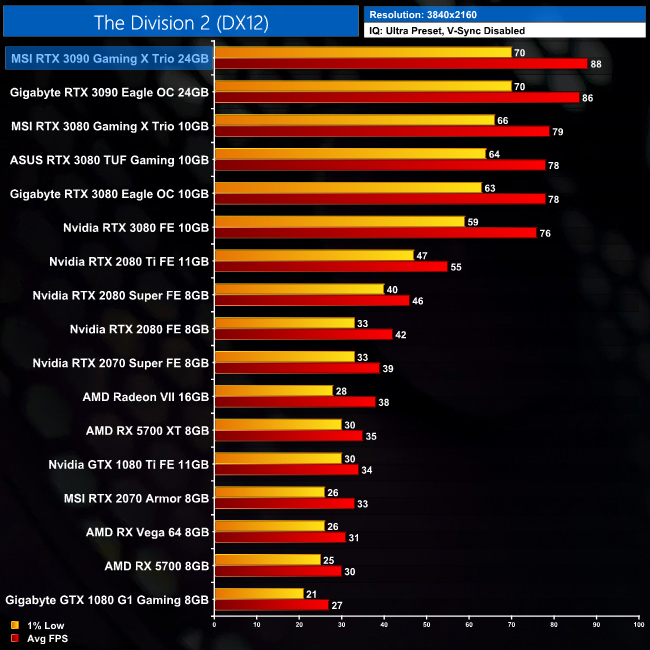 At 4K, we can see RTX 3090 delivering just shy of 90FPS on average in The Division 2. This is a 60% improvement over the RTX 2080 Ti, and that's the biggest margin between these two GPUs across all of our game benchmarks today. Compared to the RTX 3080 Founders Edition, MSI's RTX 3090 is 16% ahead.