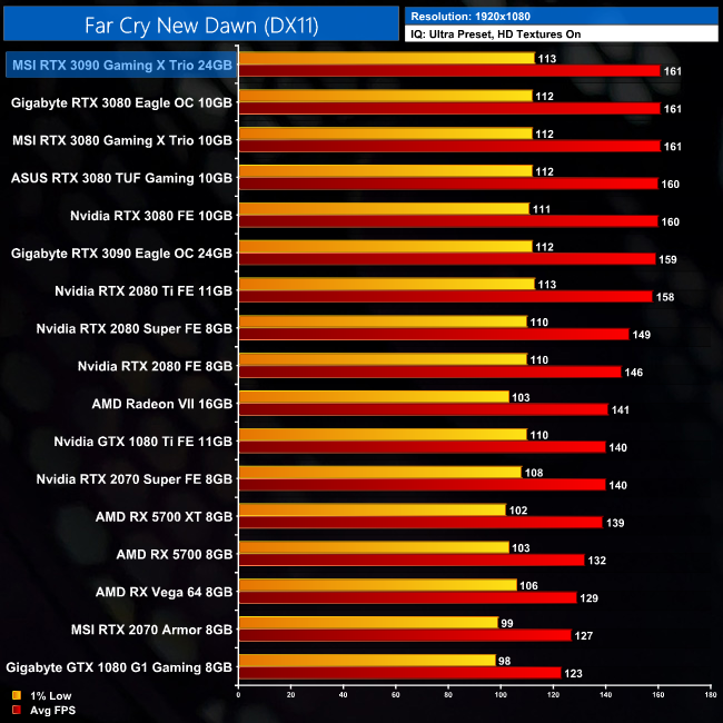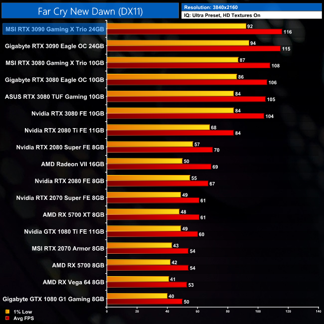 The margins tighten up somewhat in Far Cry New Dawn. Here, the MSI RTX 3090 is 38% faster than RTX 2080 Ti, and 12% faster than the RTX 3080 FE, when testing at 4K. It's still able to push almost 120FPS at this resolution, delivering a very smooth experience.