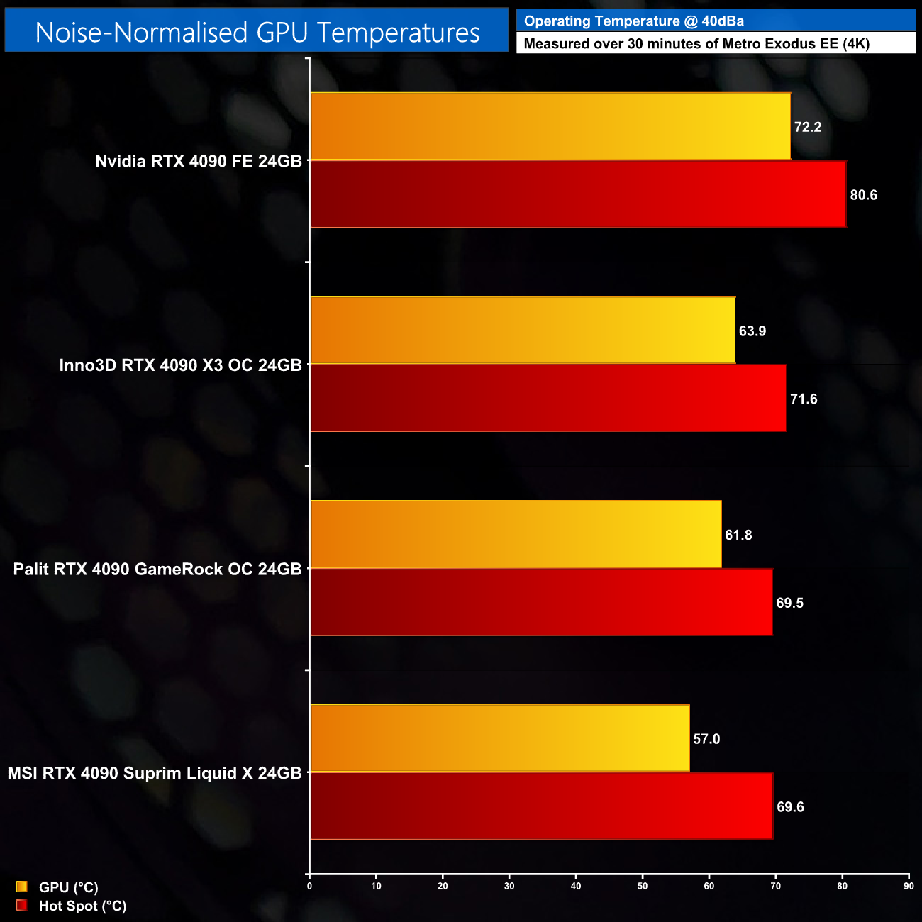 Raising fan speeds to hit 40dBa, we can see noise-normalised GPU temperatures are the best yet, with the Suprim Liquid X keeping the GPU about 5C cooler than the Palit GameRock OC. The hot spot temperature is still running a bit hotter however, coming in just shy of 70C.