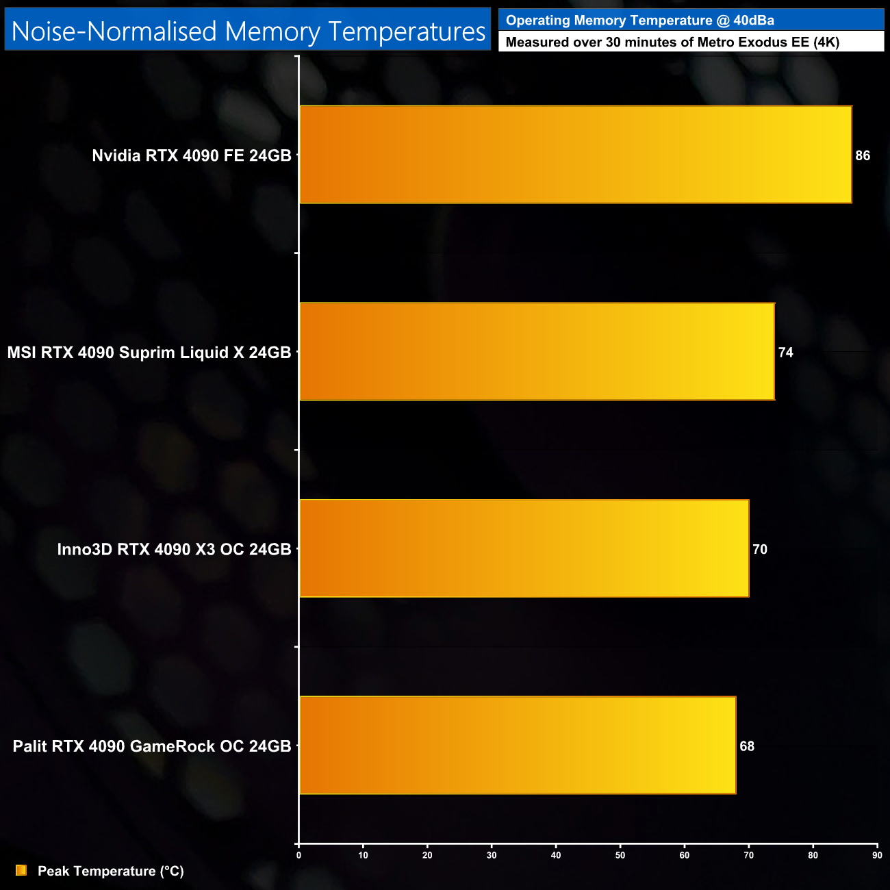 Likewise for the memory modules, a noise-normalised result of 74C makes this warmer than both air-cooled AIB cards we've tested, though it is still an improvement on the Founders.