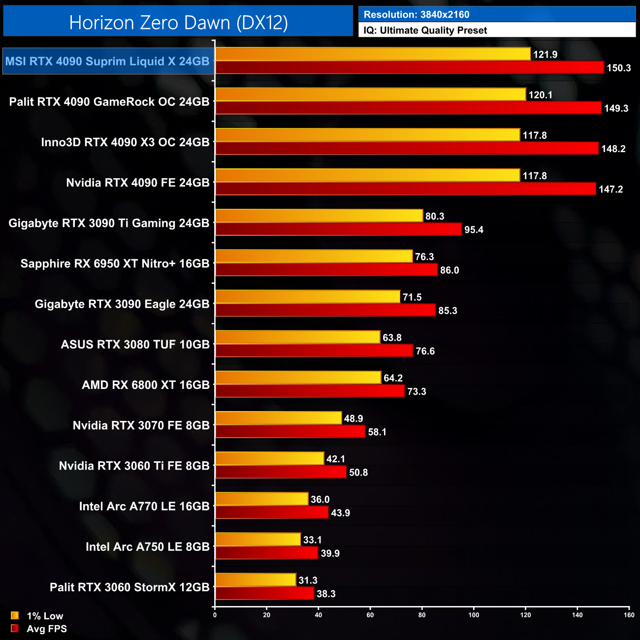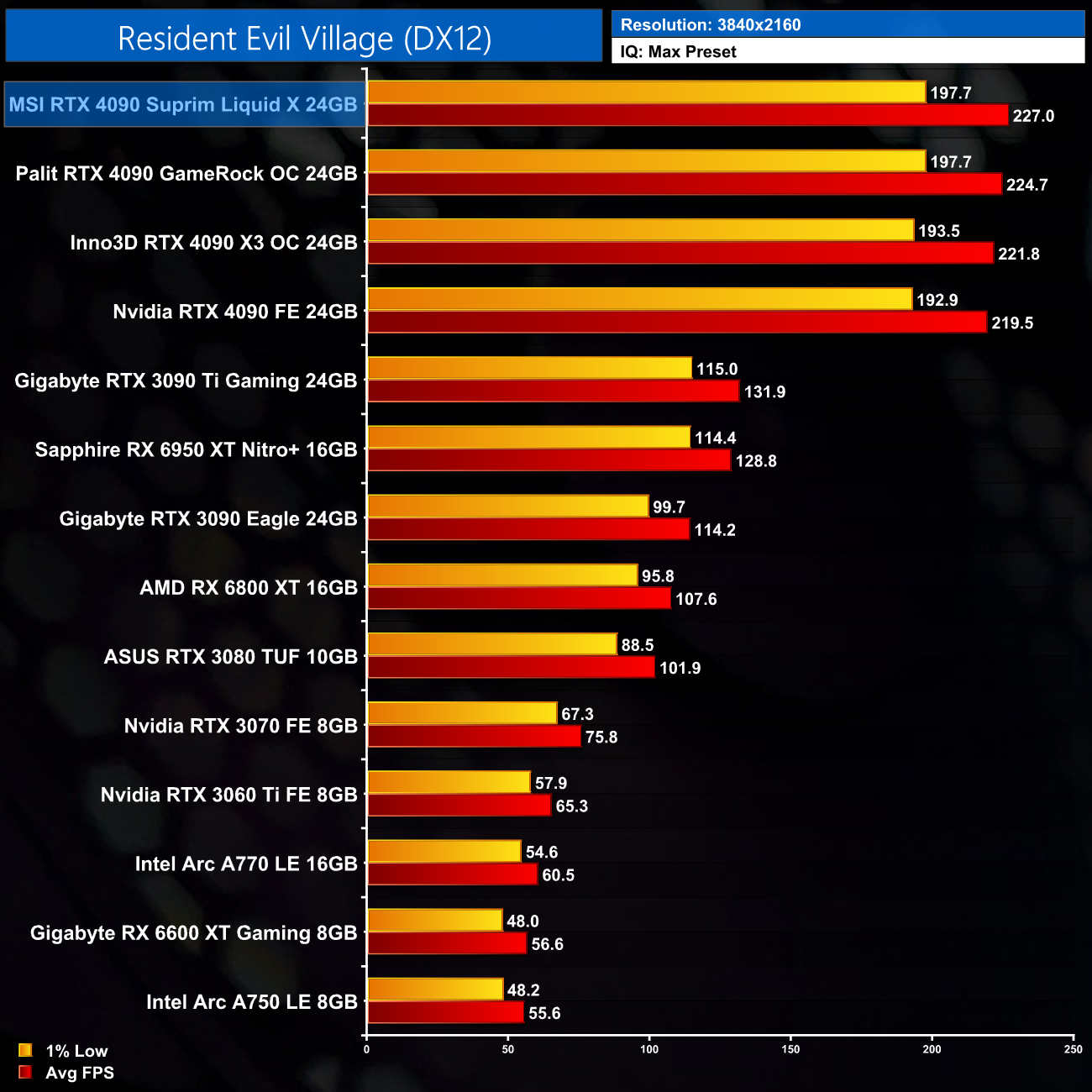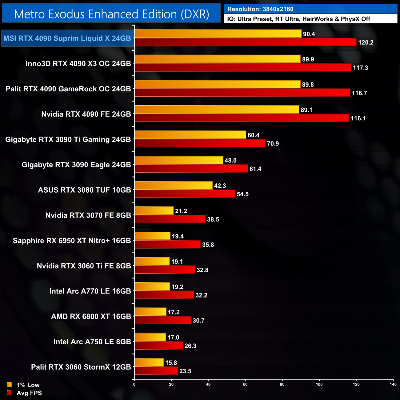 Over the 5 games we tested, the Suprim Liquid X came in at most 4% faster than the Nvidia Founders Edition, but in other scenarios, it was just 2-3% ahead. We don't focus too much on game benchmarks for the AIB reviews, as practically speaking, the differences aren't noticeable when actually gaming.