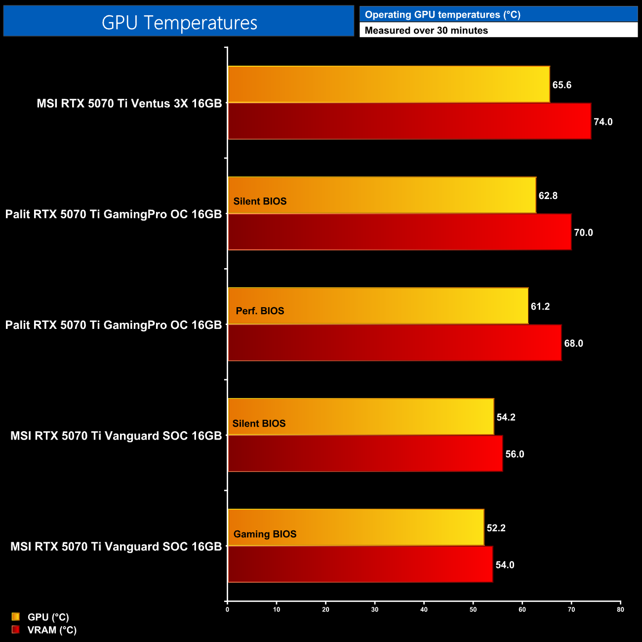 We see a much more significant improvement over the Ventus 3X when look at out of the box thermal performance. Here the Vanguard SOC delivers easily best-in-class performance, with the GPU topping out at just 52-54C, depending on the BIOS used, while VRAM temperatures remained below 60C, so that's two very impressive results.
