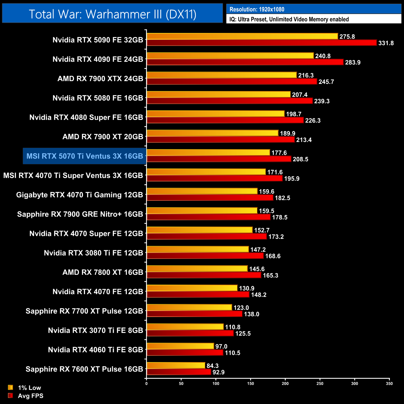 We finish up rasterised performance with Total War: Warhammer III, where the 5070 Ti delivers 148fps at 1440p, putting it on par with the RX 7900 XT, while it's 7% slower than the 4080 Super.