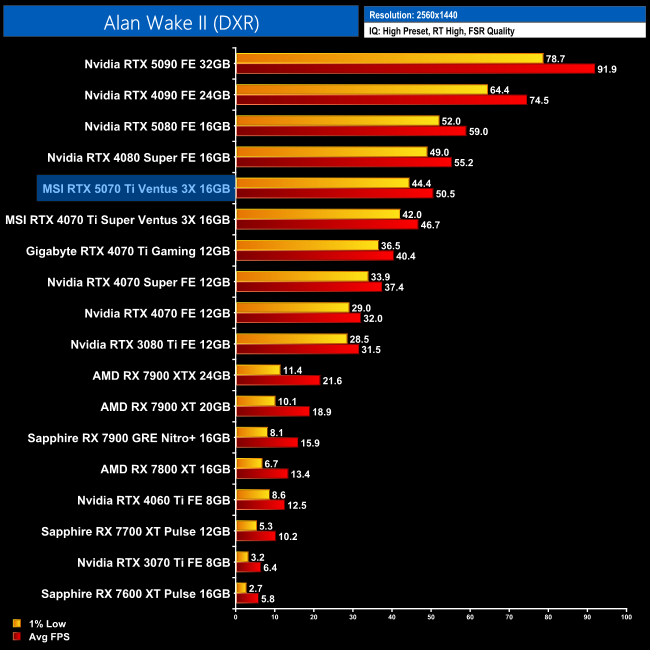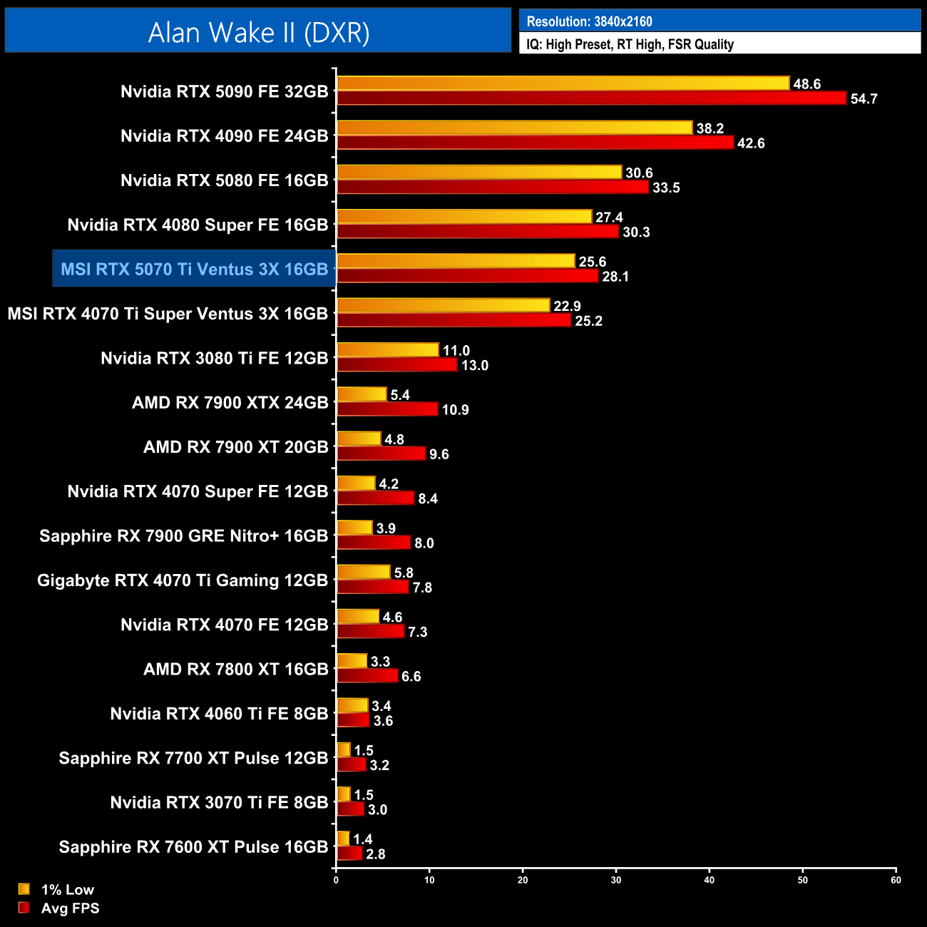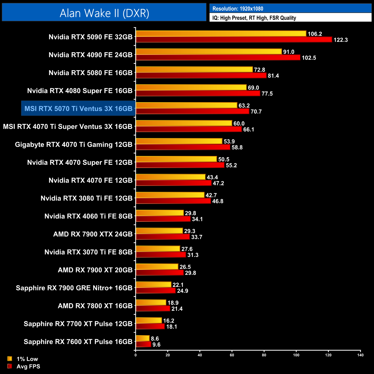 Moving onto ray tracing performance with Alan Wake 2, the top of the chart is dominated by Nvidia GPUs here, and the RTX 5070 Ti slots between the 4070 Ti Super and the 4080 Super, being 9% slower than the latter at 1440p. It is, however, in a totally different league to the RX 7900 XTX.