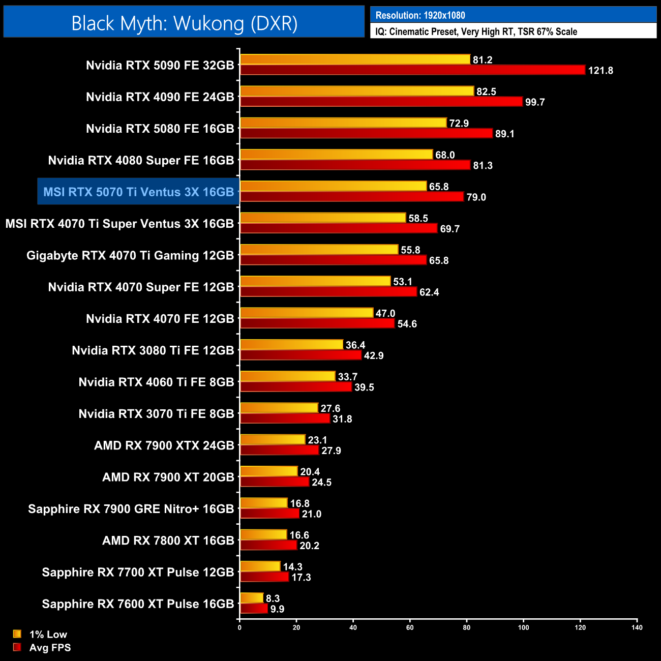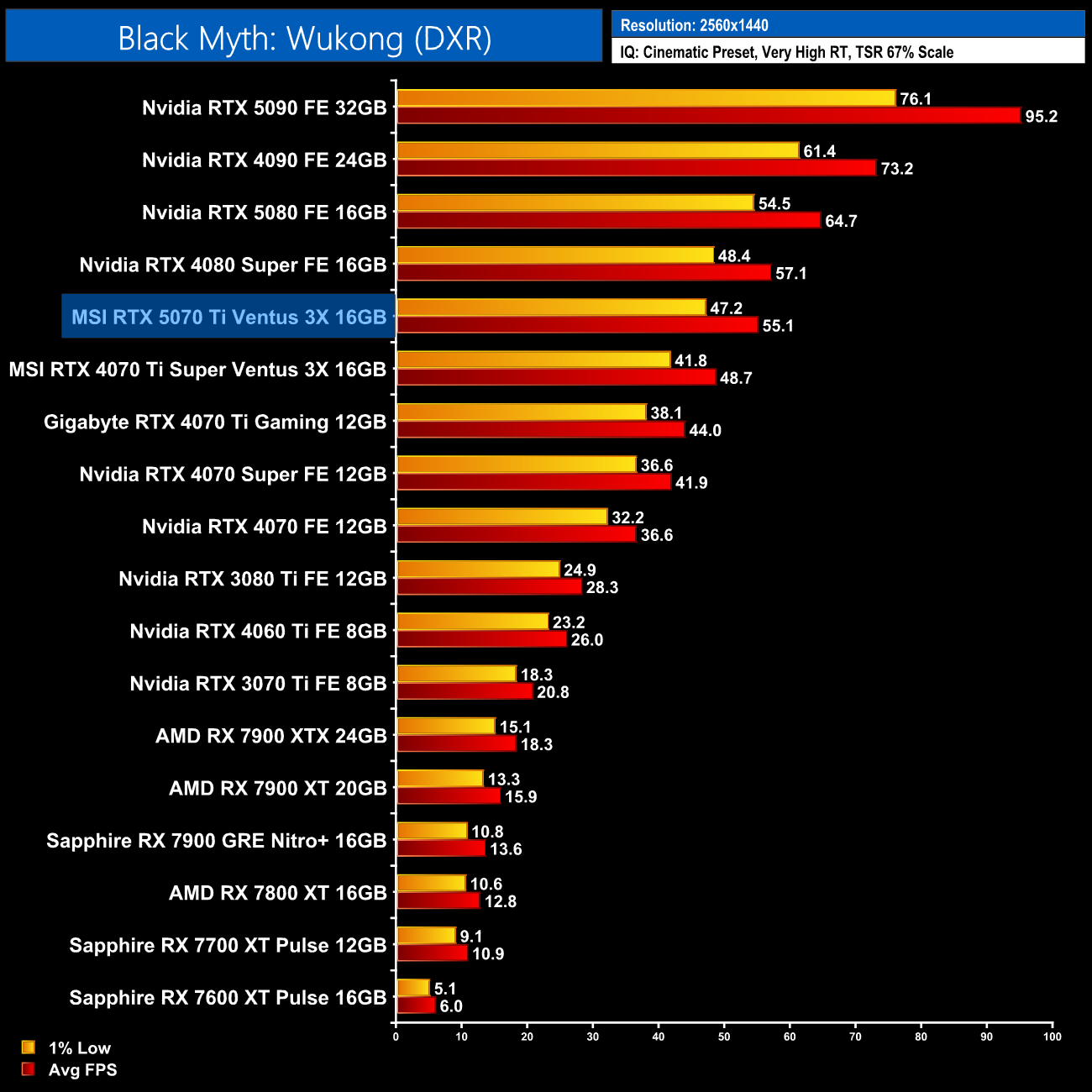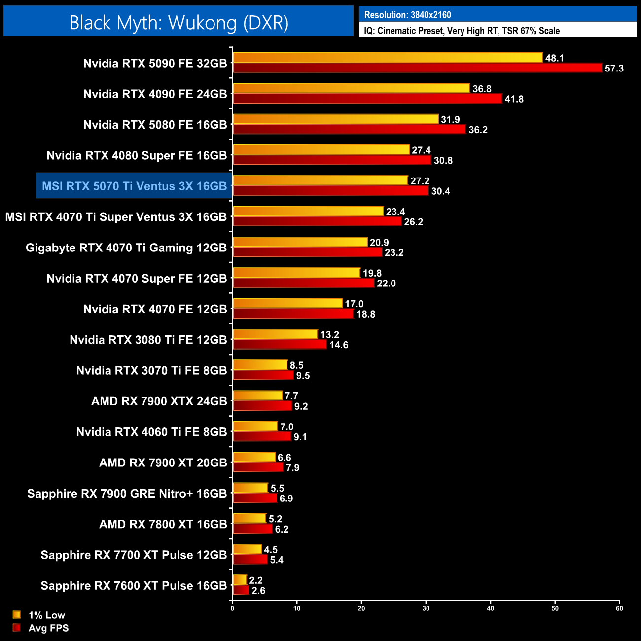 Black Myth: Wukong is another punishing title when RT is maxed out, with the 5070 Ti averaging 55fps, though that's very close to the RTX 4080 Super on 57fps.