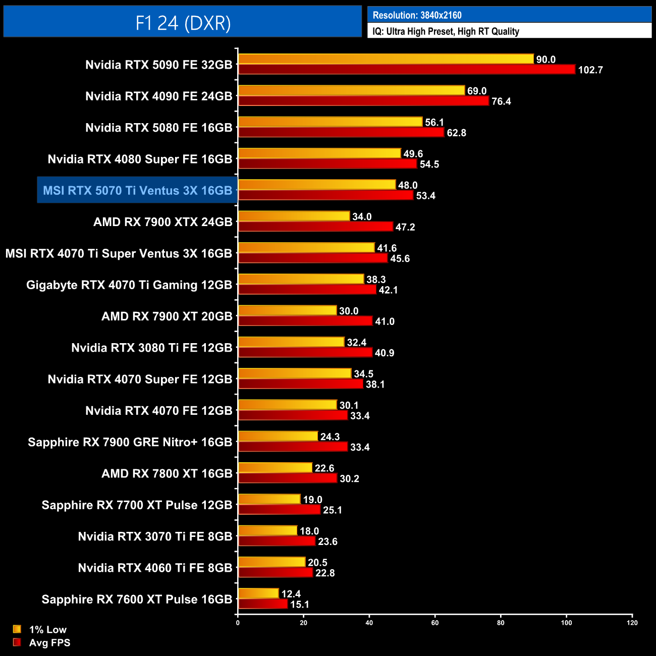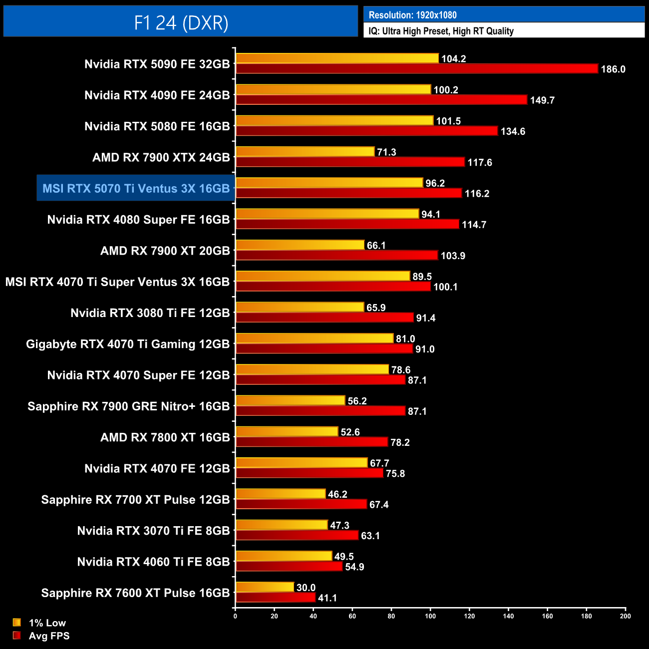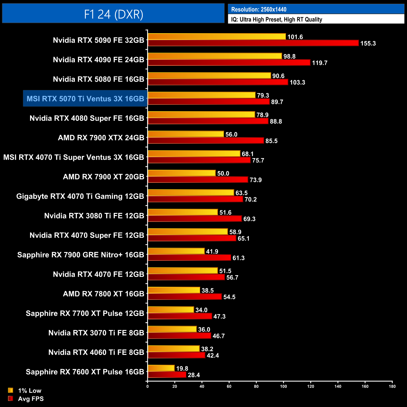 Now in F1 24, at 1440p we see the RTX 5070 Ti neck-and-neck with the RTX 4080 Super, while it's still 5% faster than the RX 7900 XTX but with much better 1% lows.