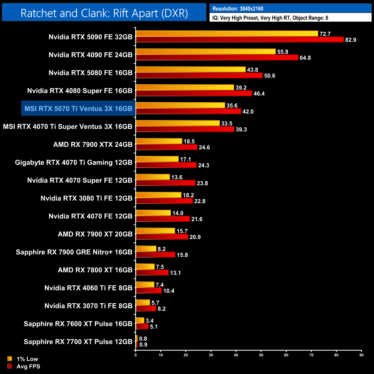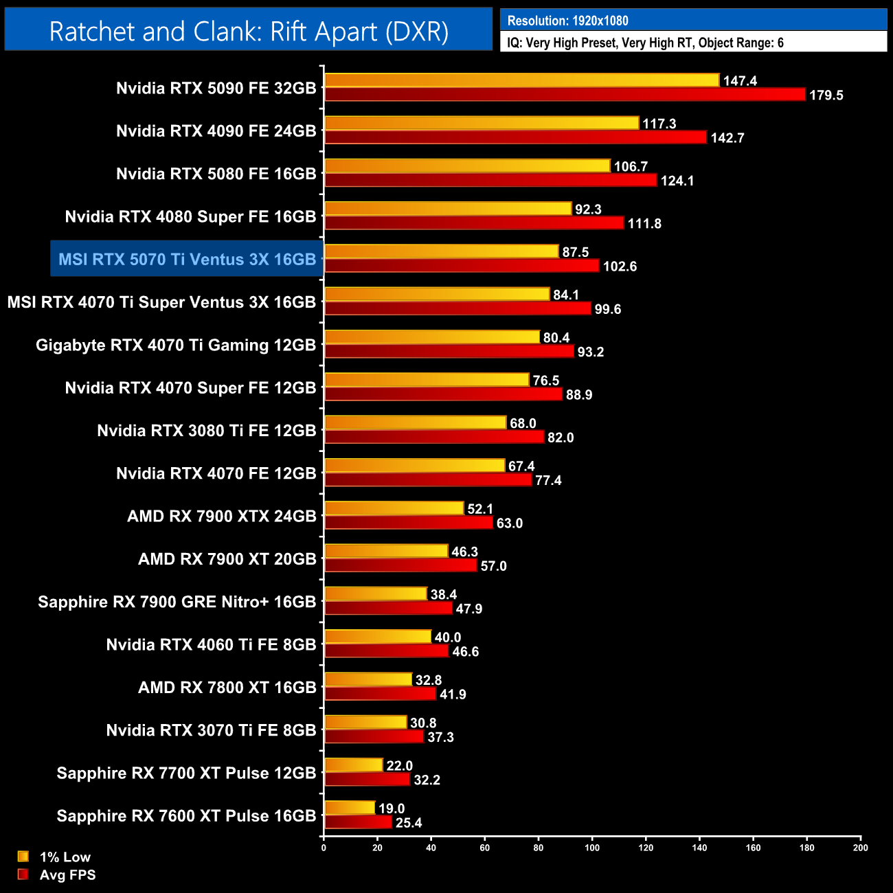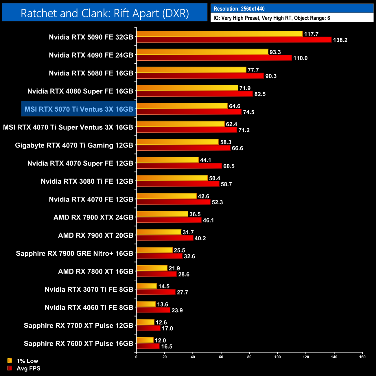 Ratchet and Clank is next and this title shows more disappointing gains over the 4070 Ti Super, given we're looking at just a 5% advantage at 1440p.
