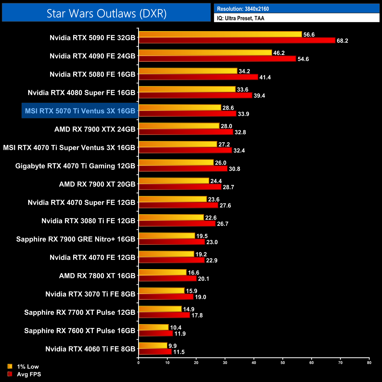 Finally, we close with Star Wars Outlaws, a more disappointing game given the relative gains over the 4070 Ti Super are meagre – just 4% at 1440p, for instance, making it 13% slower than the 4080 Super.