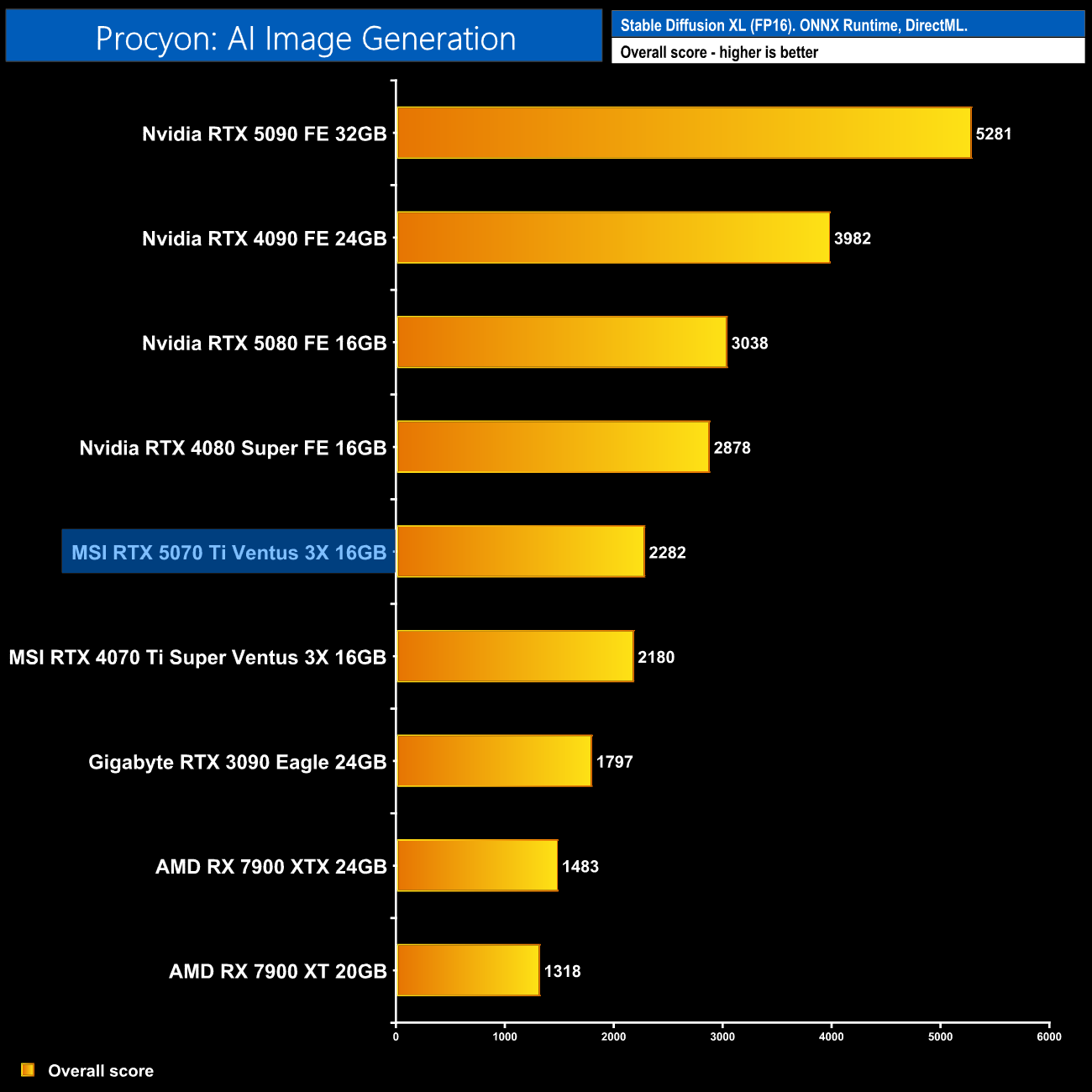 Starting with our Stable Diffusion XL FP16 image generation test, here the RTX 5070 Ti delivers just a 5% gain over the RTX 4070 Ti Super, while it's 21% slower than the RTX 4080 Super.