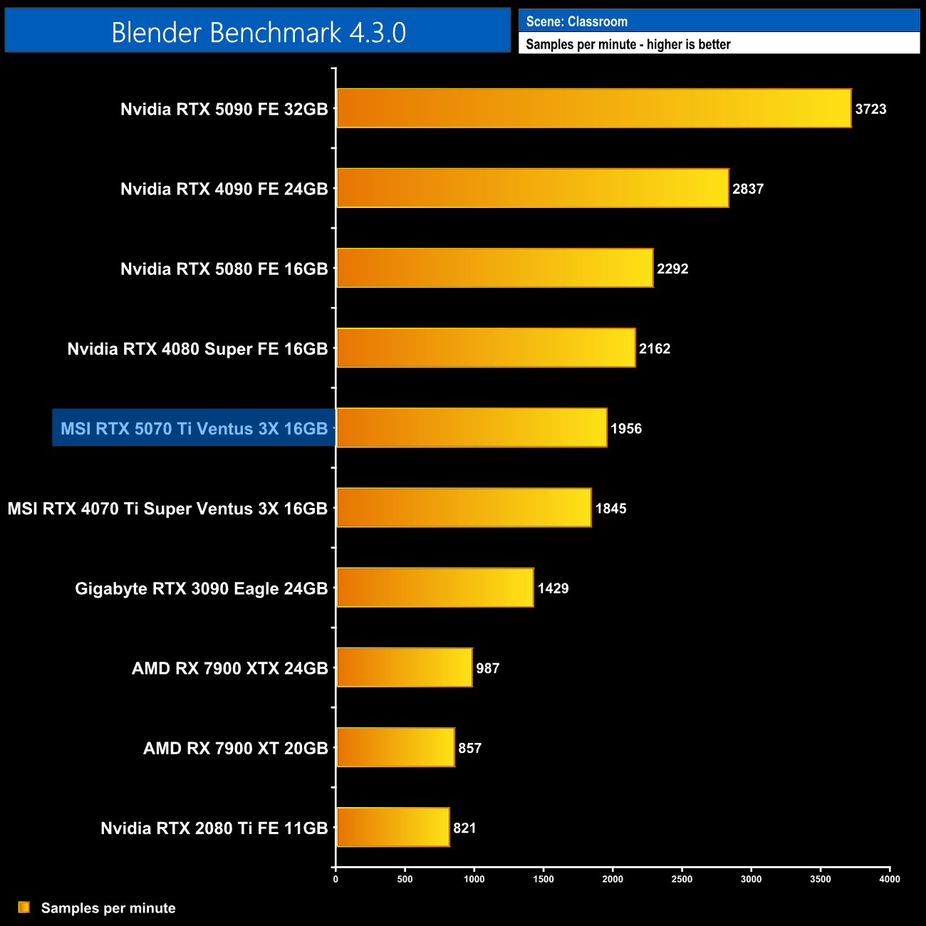Blender render performance only shows very small gains over the 4070 Ti Super, however, in the region of 6%, though it's still over double the performance of AMD's flagship.