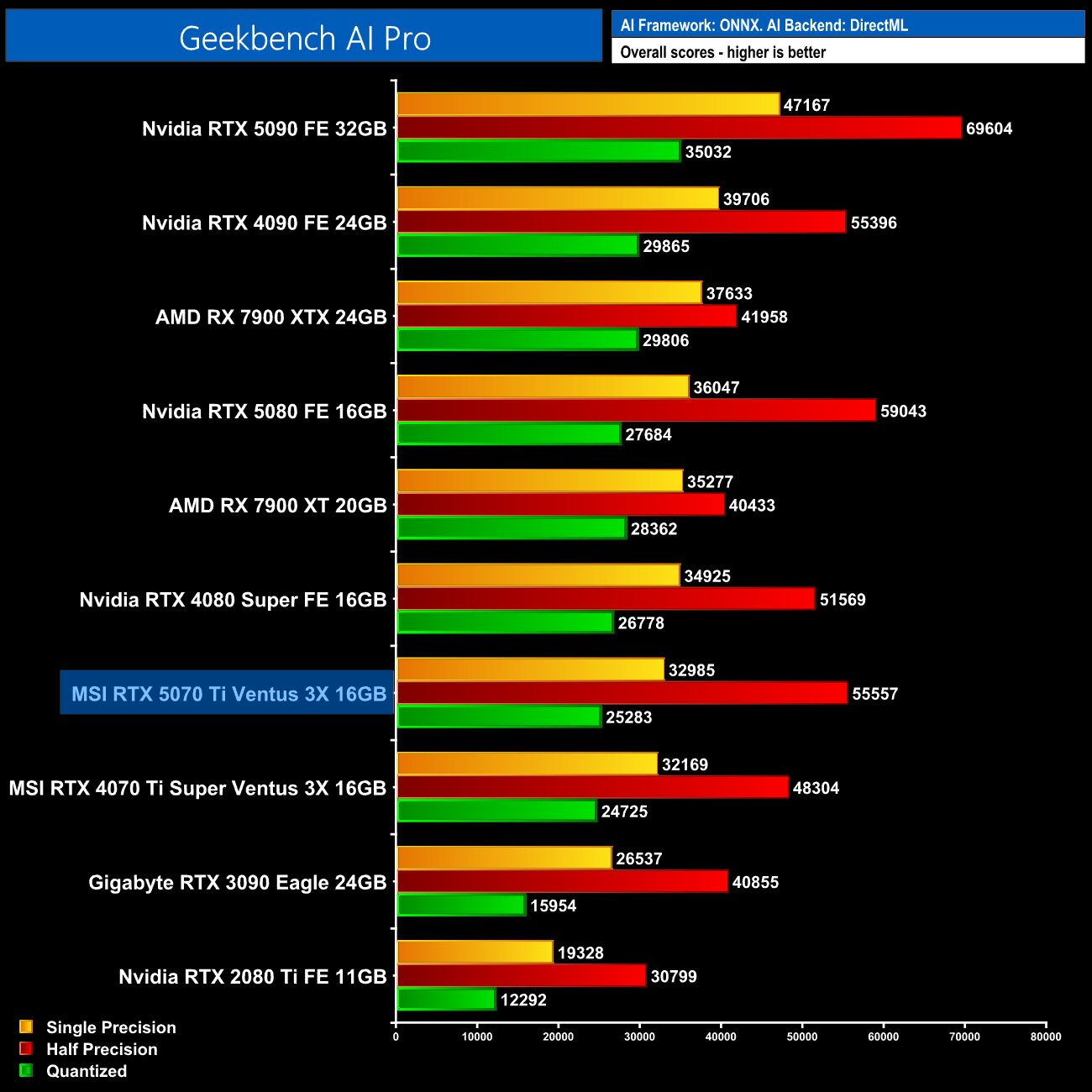 Half precision performance in Geekbench AI Pro continues to be a strong point for Blackwell GPUs, as this is another 15% gain over the 4070 Ti Super while it's even on par with the RTX 4090.