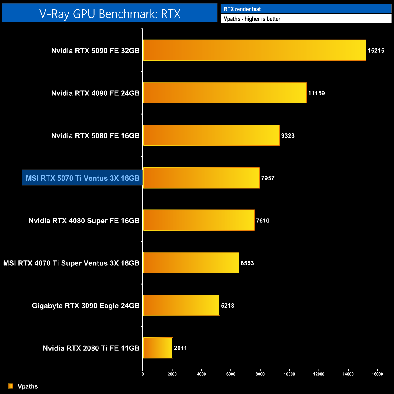 V-Ray GPU Benchmark is more impressive, however, when using the RTX path. Here, the RTX 5070 Ti is 21% faster than the 4070 Ti Super and even nudges ahead of the 4080 Super.