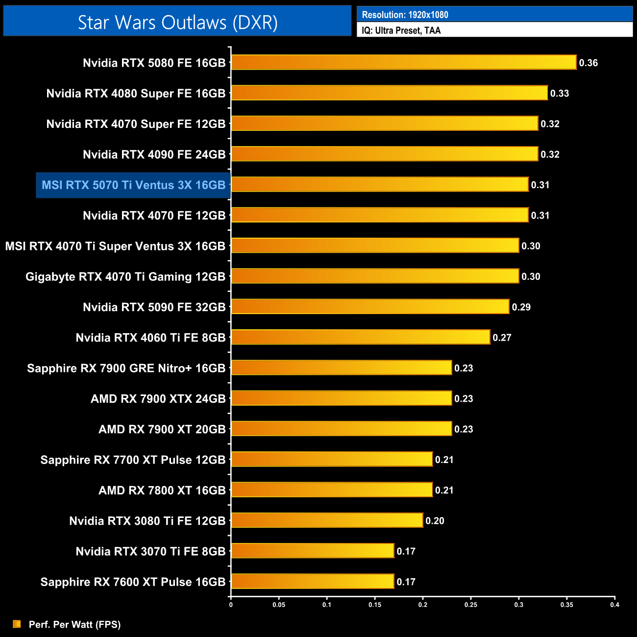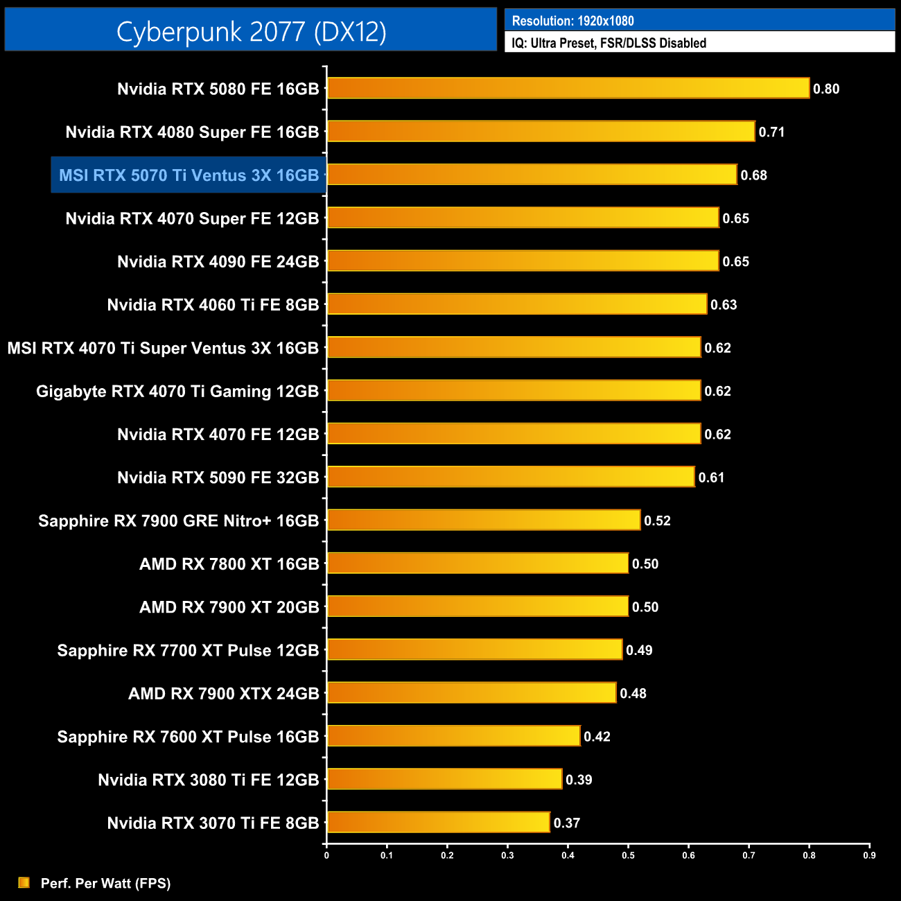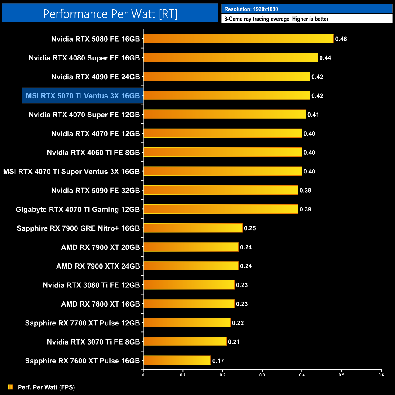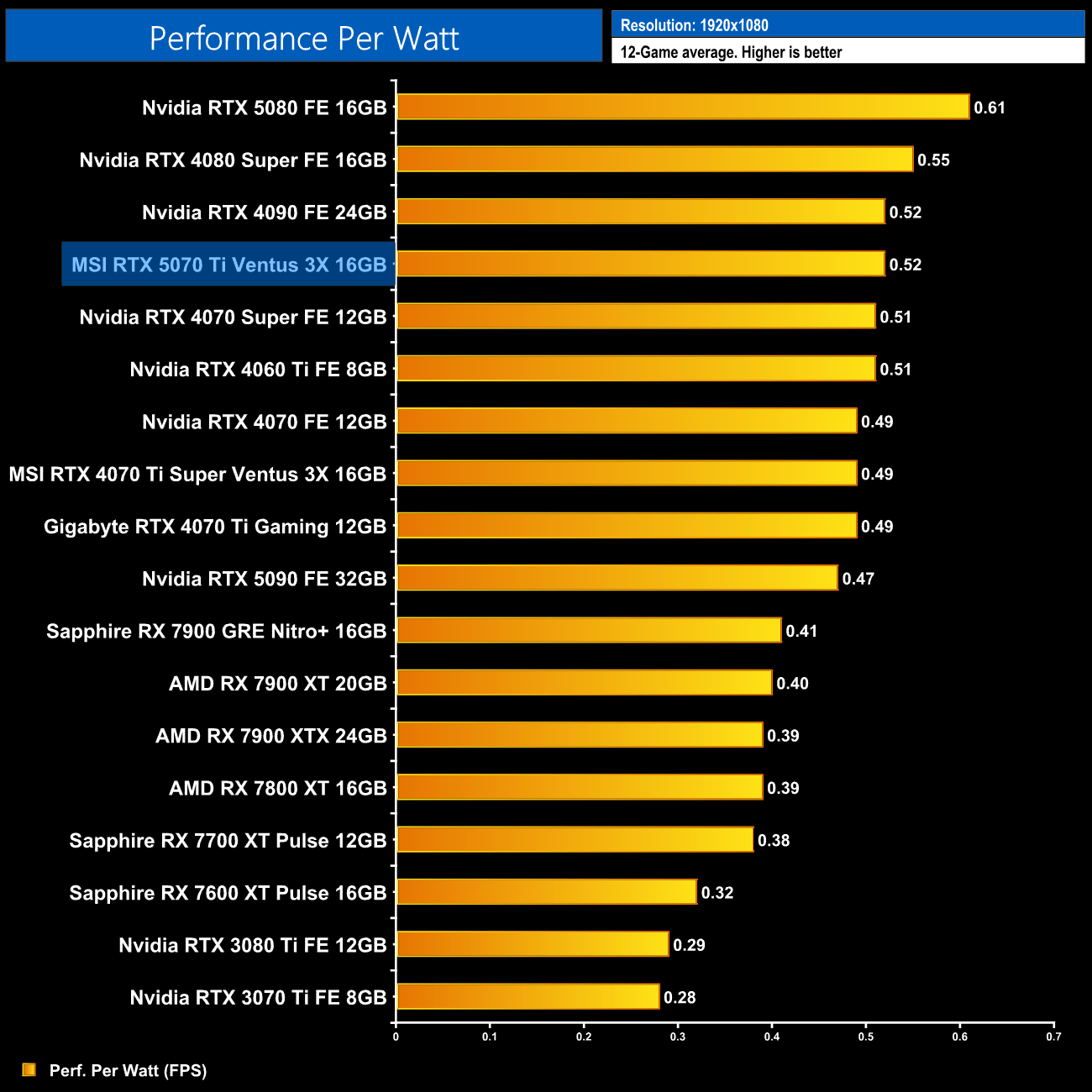 Performance per Watt is on par with the RTX 4090 at 1080p, but lags behind the RTX 5080.