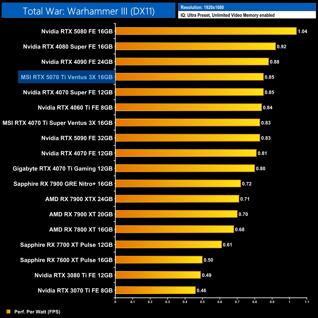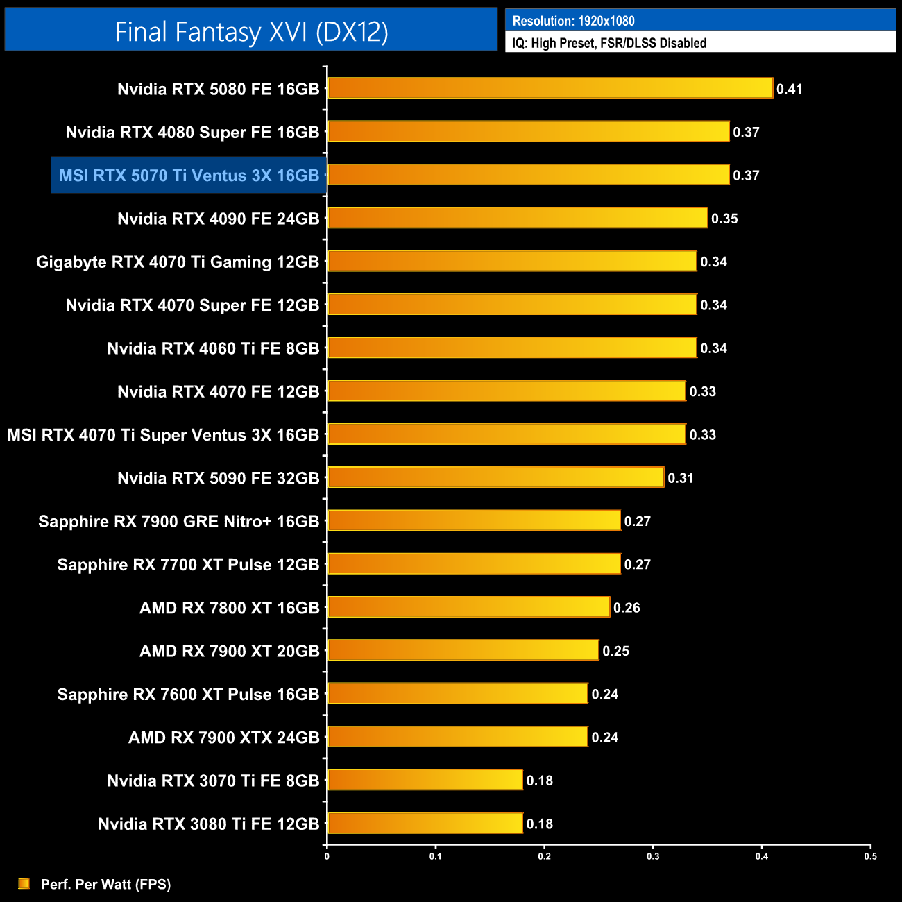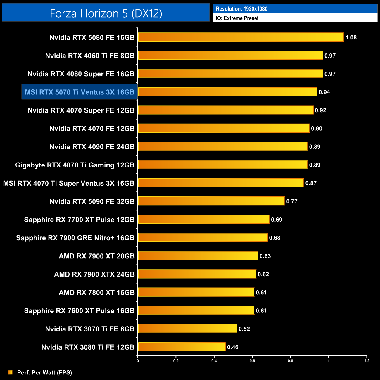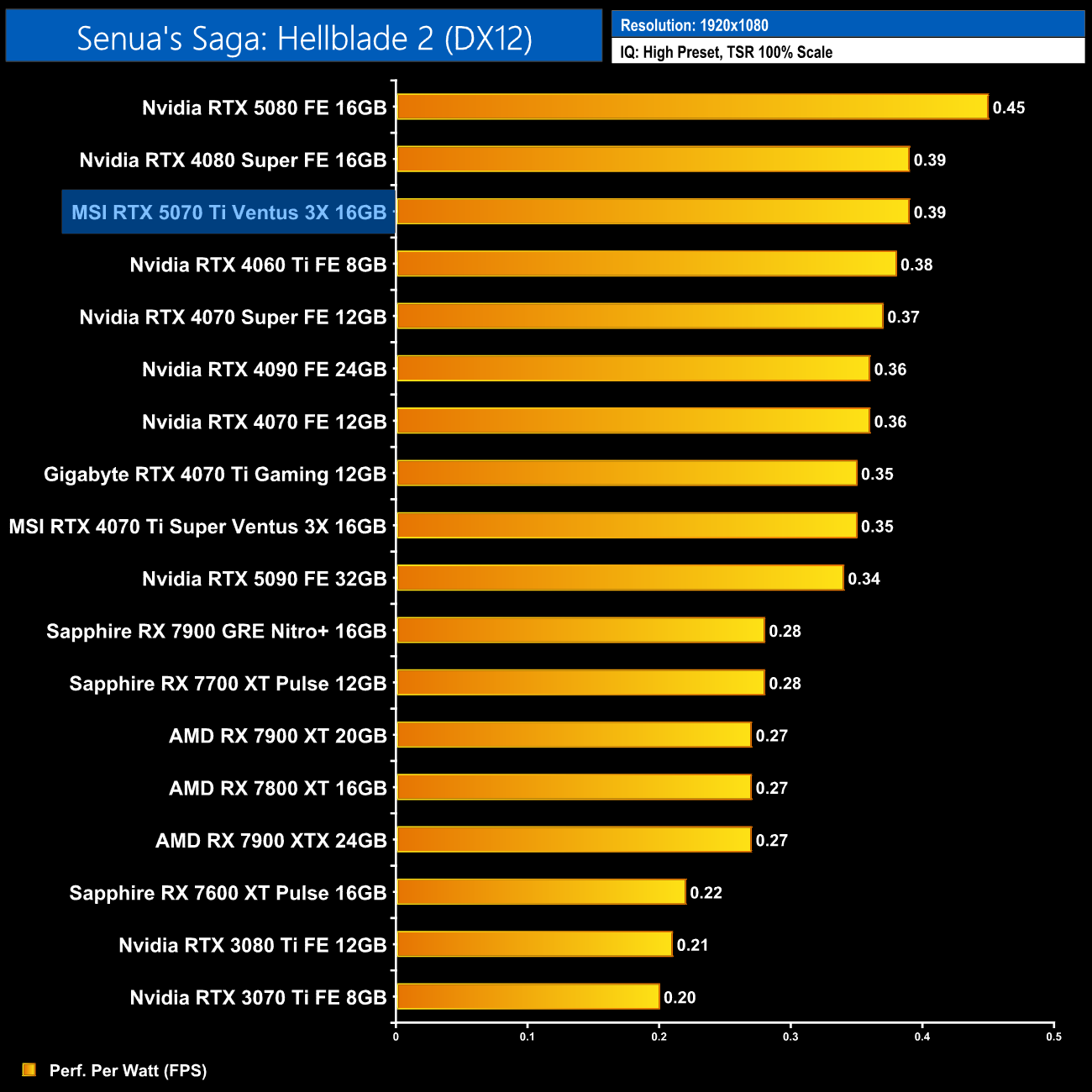 Performance per Watt is on par with the RTX 4090 at 1080p, but lags behind the RTX 5080.