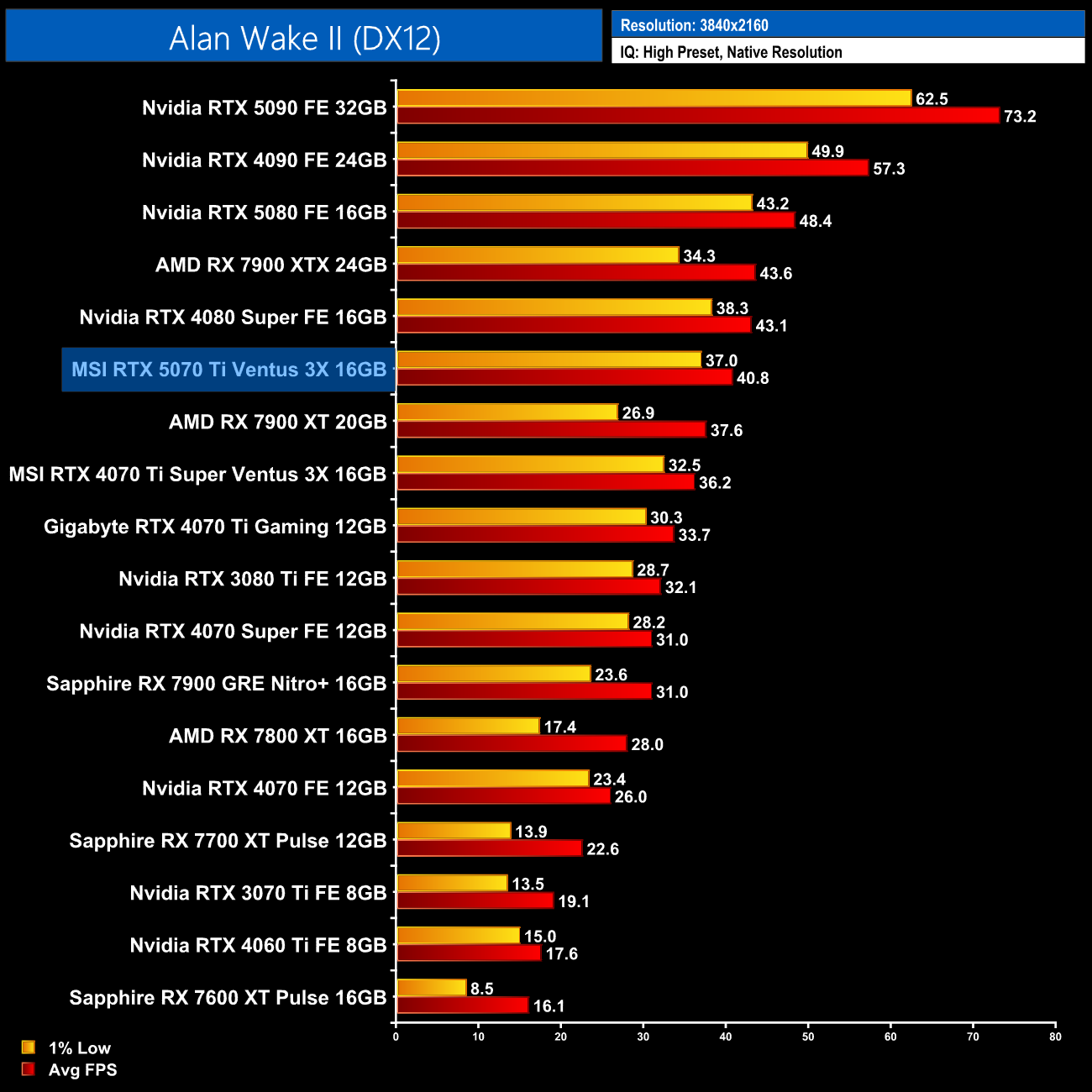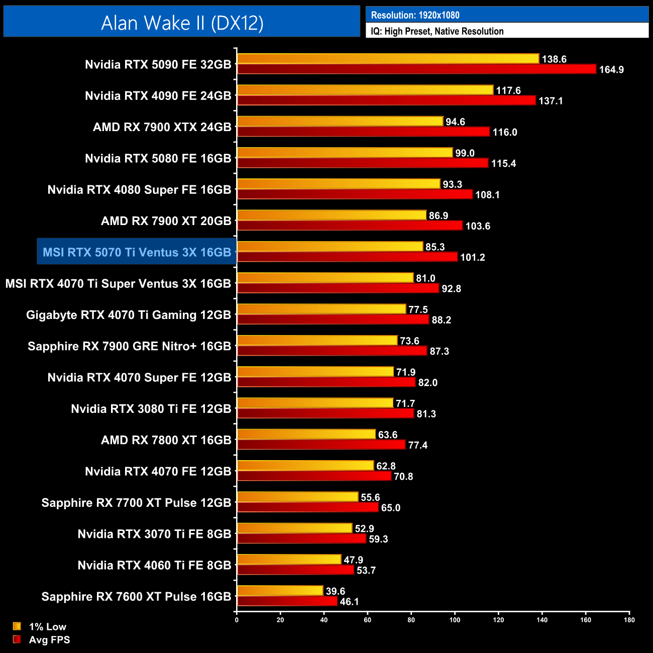 Kicking off with Alan Wake 2, at 1440p the RTX 5070 Ti delivers 73fps on average, putting it level with AMD's RX 7900 XT, while it is 6% slower than the RTX 4080 Super.