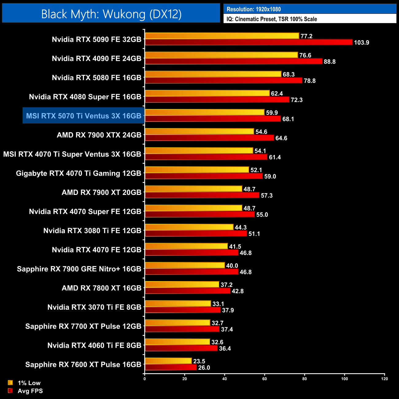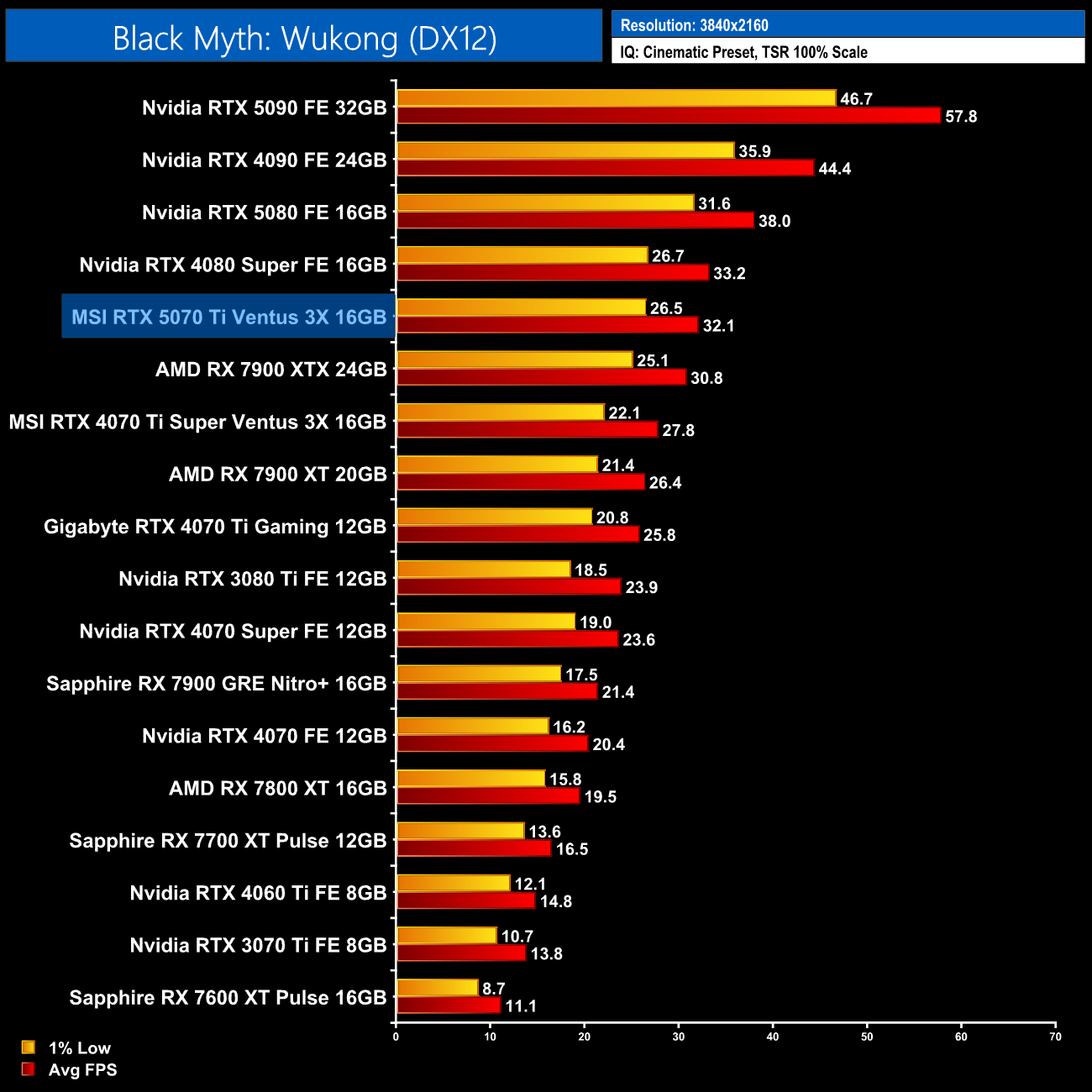 In Black Myth: Wukong, the RTX 5070 Ti looks fairly decent, hitting 53fps at 1440p, making it 12% faster than the 4070 Ti Super, while it's 5% faster than AMD's current flagship, the RX 7900 XTX.
