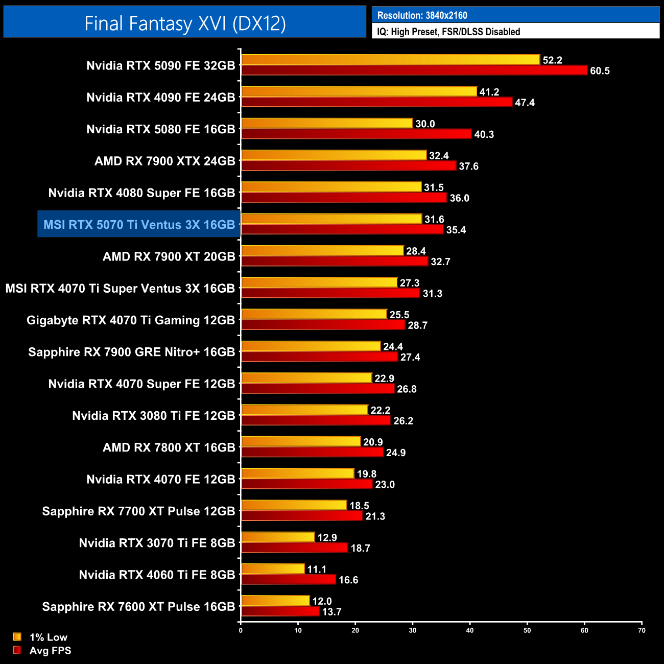 As for Final Fantasy XVI, at 1440p the 5070 Ti is once more sandwiched between the 7900 XT and 4080 Super, delivering performance just below the 60fps mark.