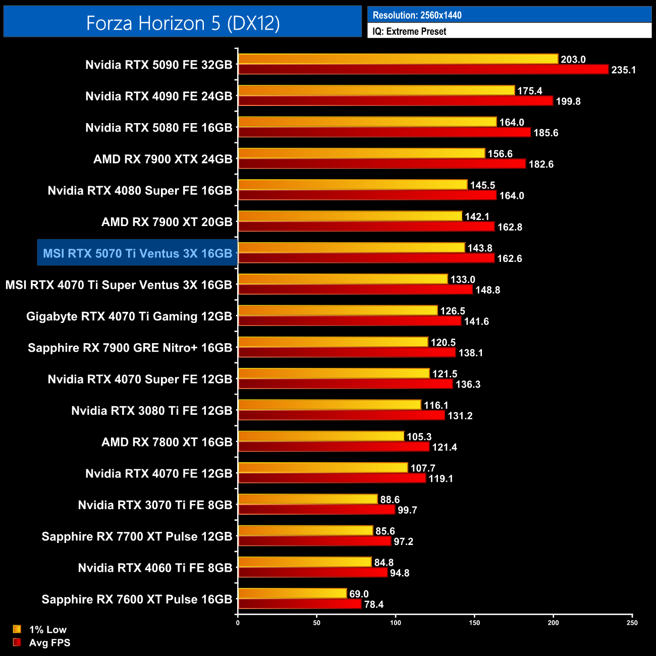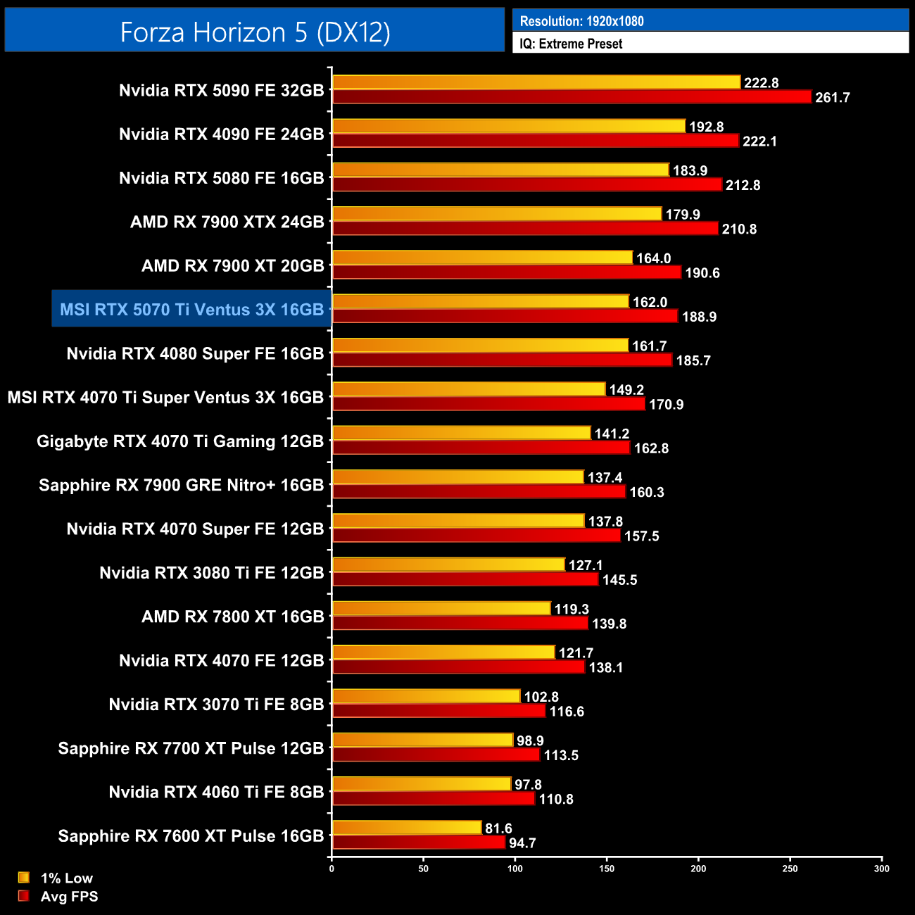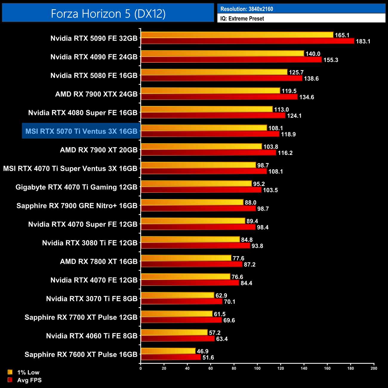 Forza Horizon 5 also shows very similar performance to both the 7900 XT and 4080 Super, with the 5070 Ti hovering around the 160fps mark.