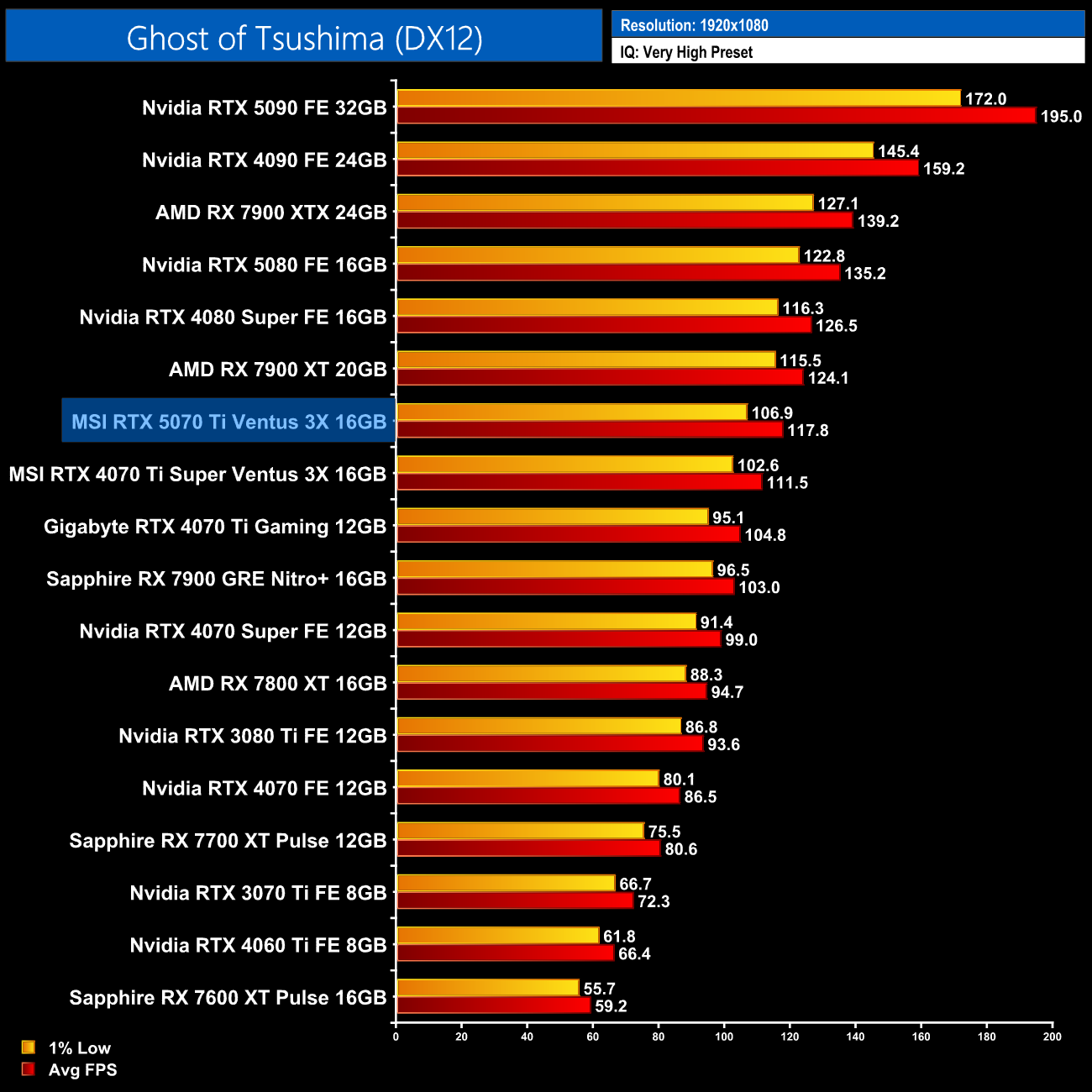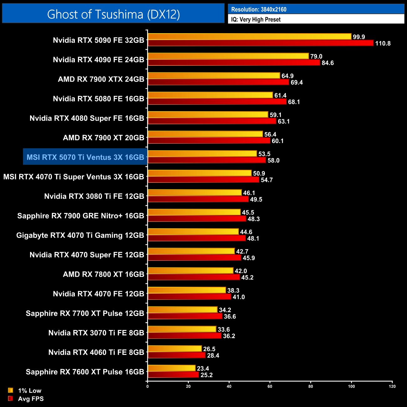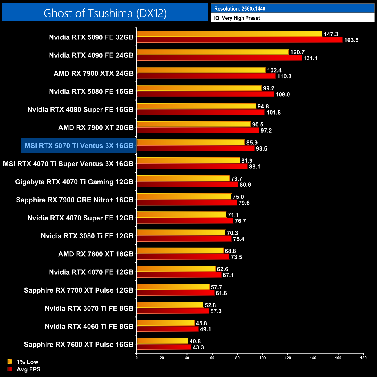 Ghost of Tsushima is slightly more disappointing as the gains over the 4070 Ti Super are more muted – we're looking at just a 6% uplift at 1440p, making the 5070 Ti 8% slower than the 4080 Super.