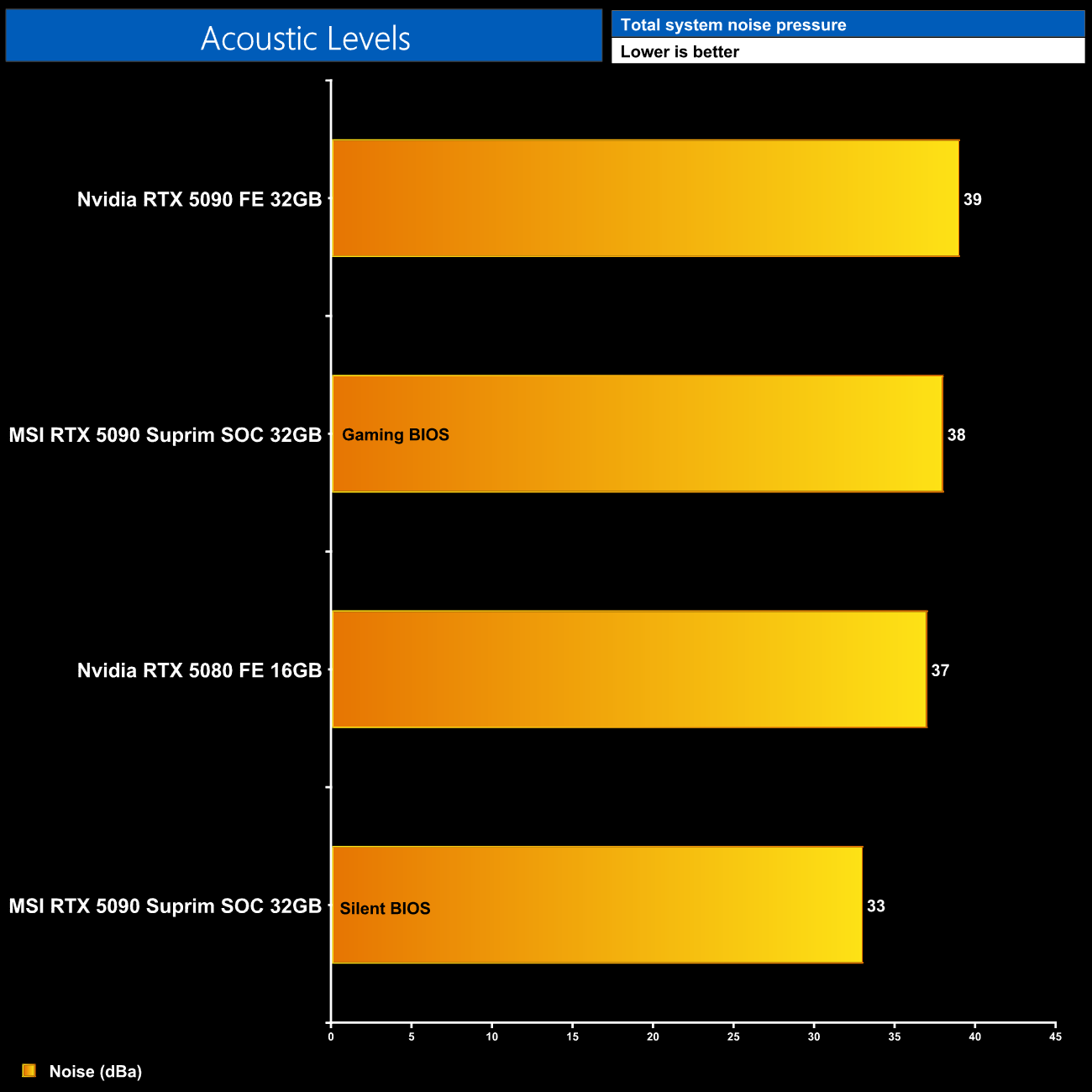 The good news is that both BIOS modes run quieter than Nvidia's Founders Edition. The Gaming BIOS saw the fans run at 1640rpm, and that produced 38dBa on my sound meter. The Silent BIOS, meanwhile, runs the fans at just 1100rpm, producing a whisper-quiet 33dBa – only just above the noise floor of my testing environment, so it is very quiet indeed.