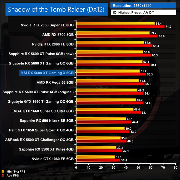 Shadow of the Tomb Raider shows very similar performance margins to Red Dead Redemption 2. For instance, the Gaming X is no more than 3% faster than the Pulse with its old BIOS, either at 1080p or 1440p. The Pulse when running the new BIOS, however, is 6% faster at 1080p and 7% faster at 1440p.