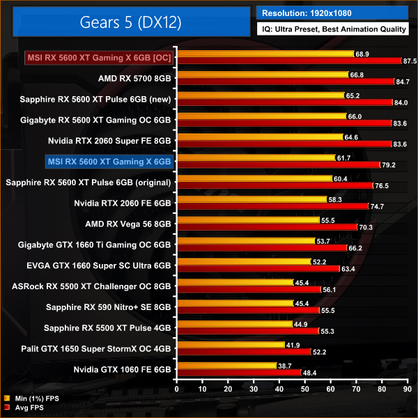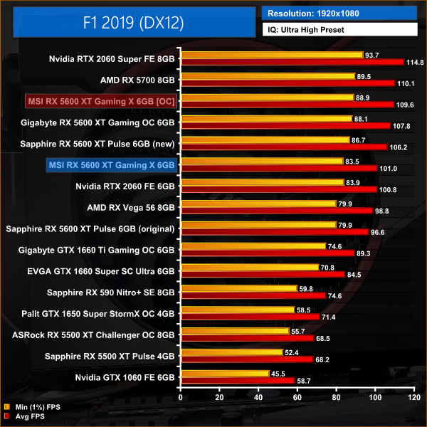 Despite a negligible increased to GPU frequency, as expected the memory overclock brings significant gains to our game testing. F1 2019 saw a 9% improvement in average frame rate, frame rates in Gears 5 improved by 10%, and Metro Exodus saw an 8% performance improvement.