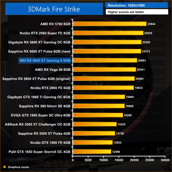 Kicking things off with our 3DMark benchmarks, we can immediately see the Gaming X is at a disadvantage compared to the Sapphire Pulse (14Gbps and 1750MHz boost clock with the BIOS update.) Across all three benchmarks, the Gaming X is 6% slower than the Pulse due to its slower memory.