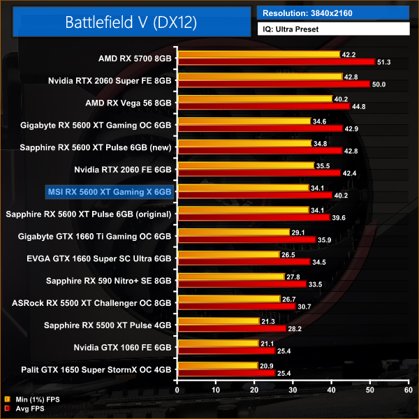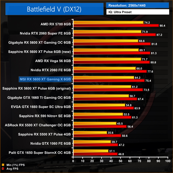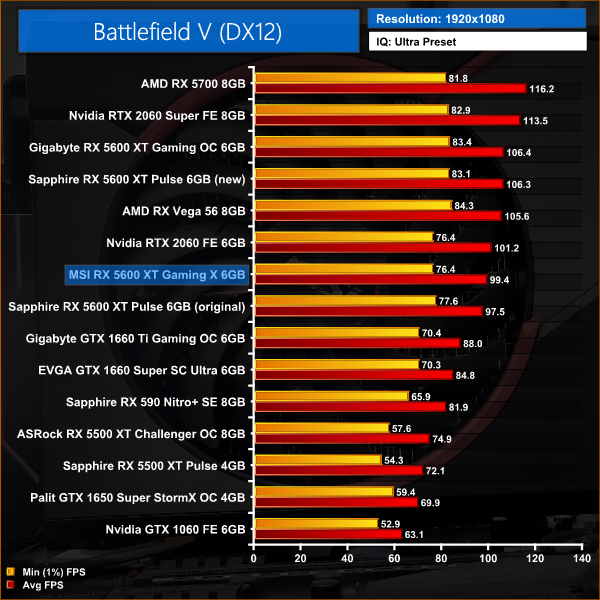 Our first game today is Battlefield V, and at 1080p we see the Gaming X coming in 6% slower than the Sapphire Pulse 5600 XT with its updated BIOS, and 2% slower than the RTX 2060. Compared to the Sapphire Pulse with the old BIOS, the Gaming X is 2% faster thanks to its higher core speed.