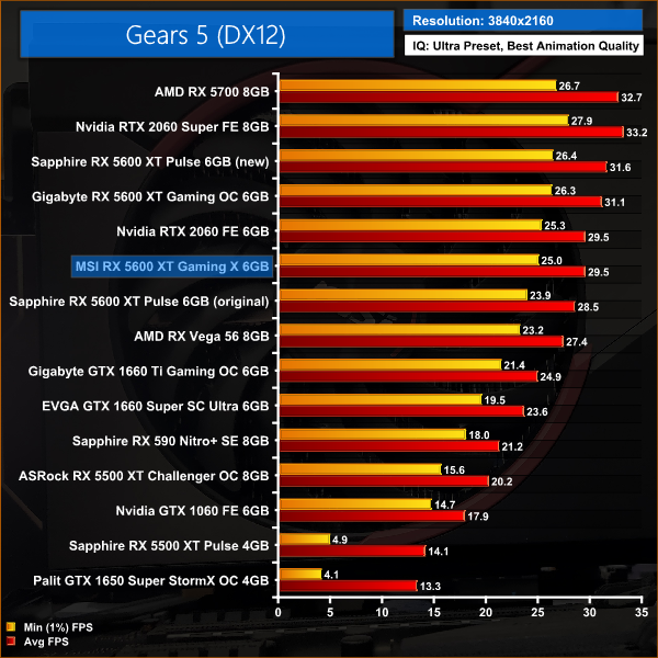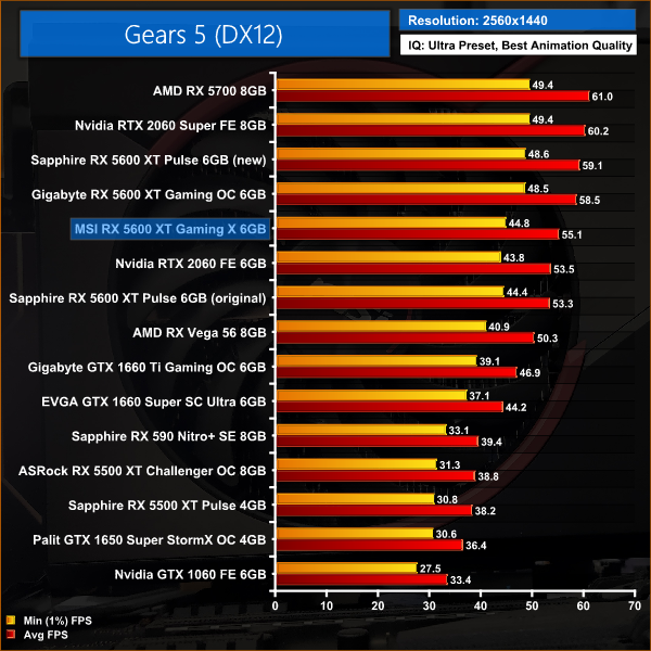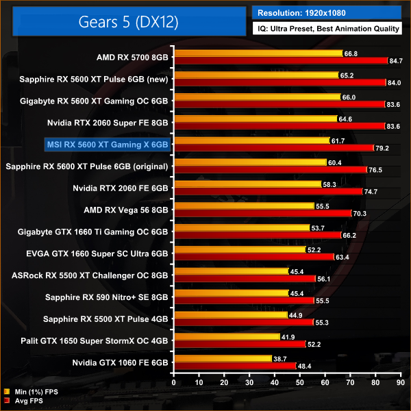 Gears 5 sees the Gaming X fall further behind the other 5600 XTs which are running 14Gbps memory – at 1080p, for instance, it is 6% slower than the Pulse using its updated BIOS. Compared to the Pulse running 12Gbps memory, the MSI card is 4% faster.