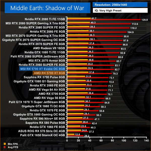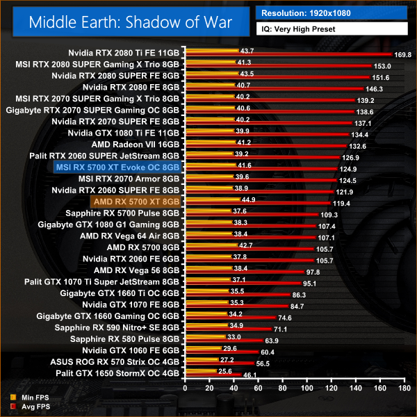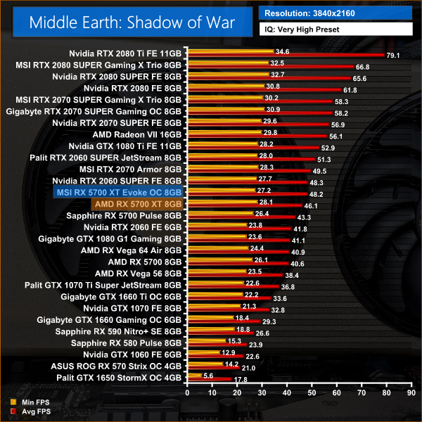 Middle Earth: Shadow of War shows the biggest improvements for the Evoke OC, as here it comes in 5% faster than the reference design at 1080p and 4K resolutions.
