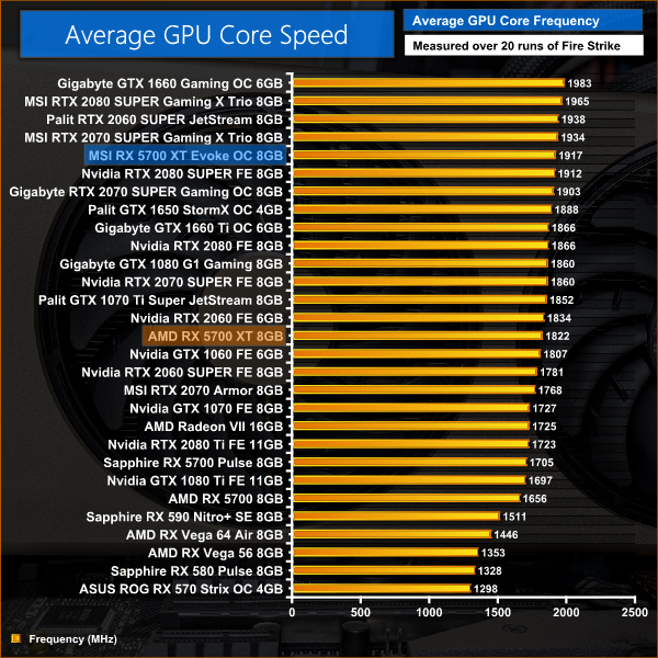Despite its rated game clock coming in at 1835MHz, in our testing the Evoke OC averaged 1917MHz when under load. This puts it 95MHz faster than the reference card, which averaged 1822MHz, with that increase in frequency resulting in 3% performance gains on average for the Evoke OC.