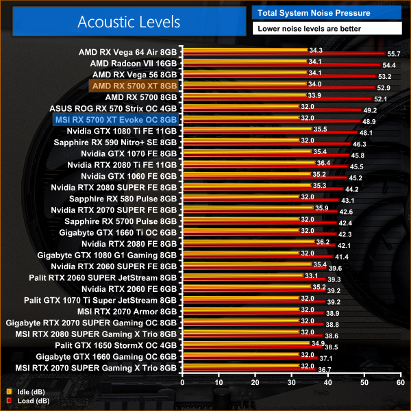 There is a clear and obvious reason as to why the GPU runs so cool – and that is fan speed. Under load, we saw the Evoke OC run its fans at 64%, around 2050rpm, and that results in a pretty loud card. It is quieter than reference, but to be honest that isn't a great yardstick to be measuring performance with. In my mind, MSI has clearly just prioritised temperatures over noise levels, resulting in a poorly-balanced fan curve.