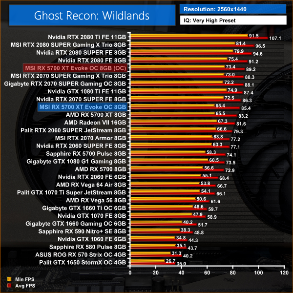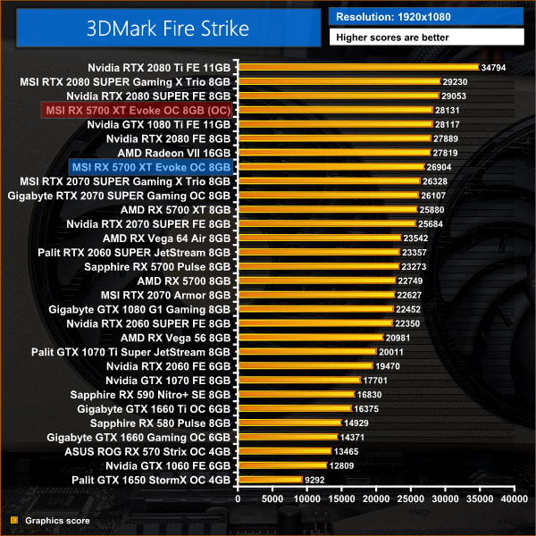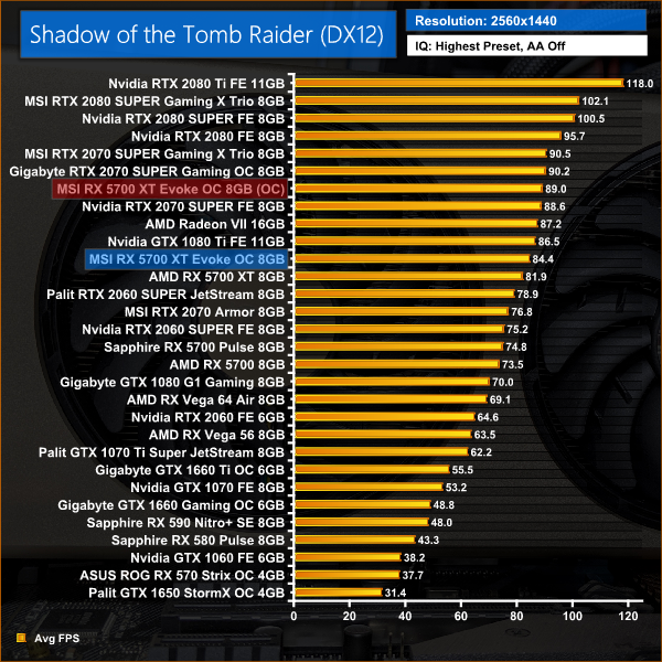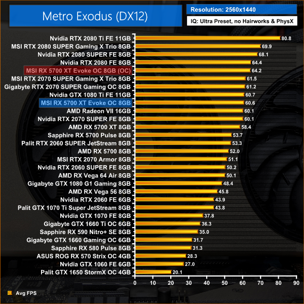 This extra frequency scaled perfectly with our extra games testing, where we saw an average performance uplift of 5%. This puts the manually-tuned Evoke OC almost 9% ahead of the stock RX 5700 XT.