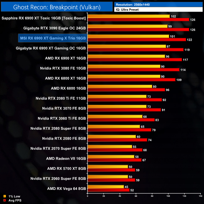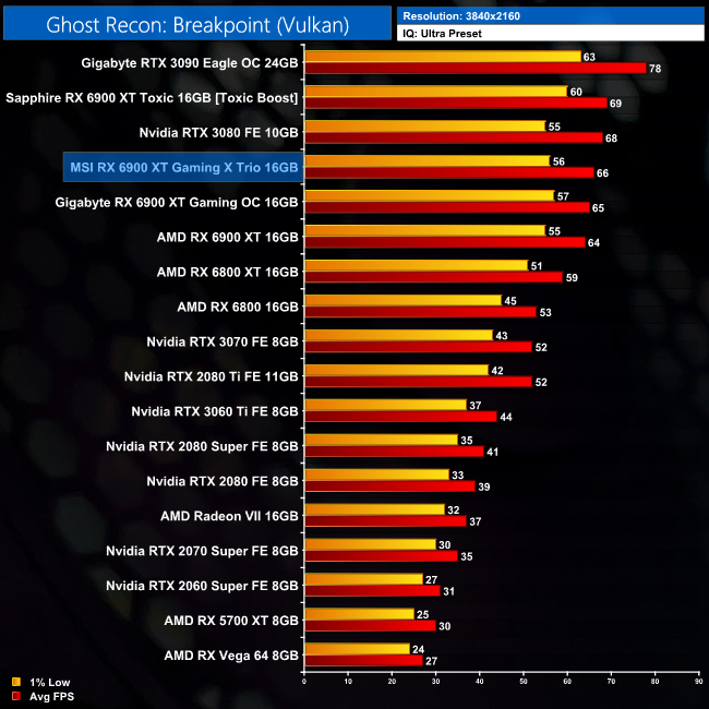 Here we come to Ghost Recon Breakpoint. The Gaming X Trio is once more looking at a sizable 15% performance deficit compared to the RTX 3090 at 4K. It is however 3% faster than the reference card.