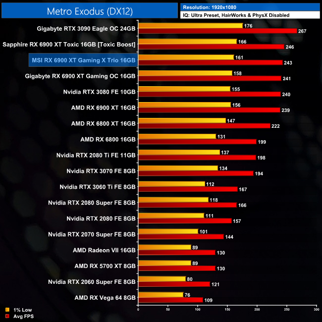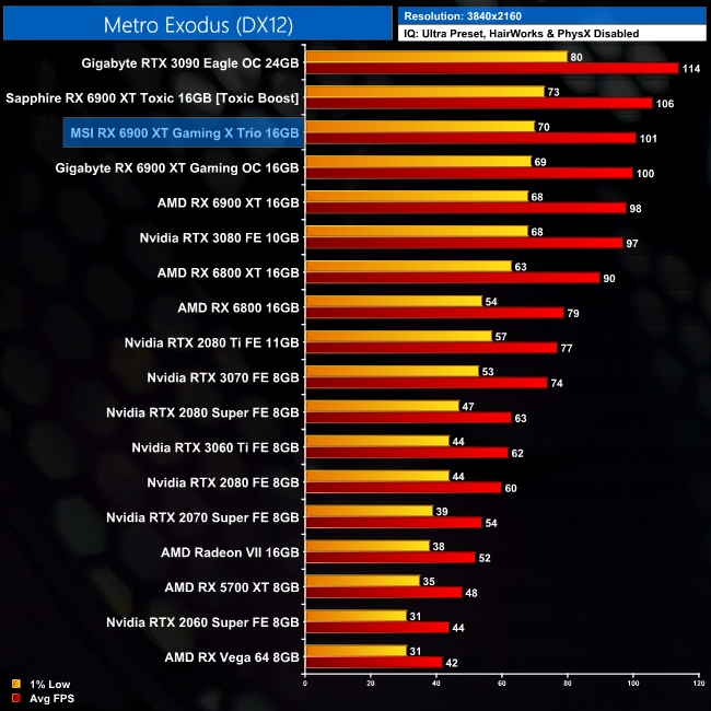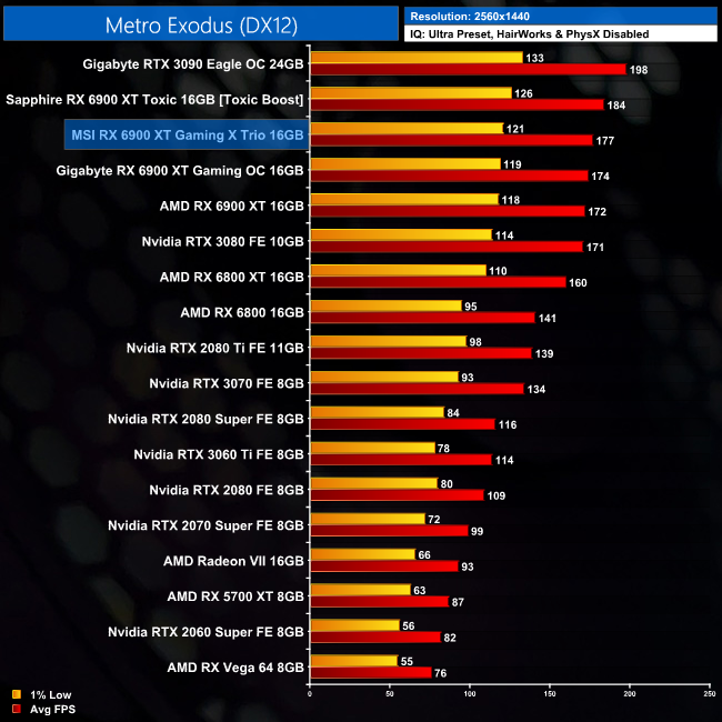 Metro Exodus sees the Gaming X Trio outperform the reference card by 3%, at both 1440p and 4K. It is 11% slower than the RTX 3090 at both resolutions.