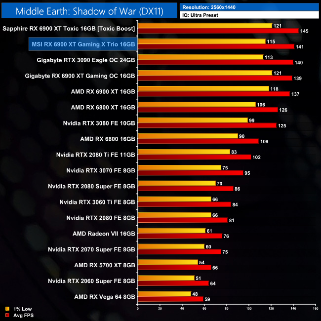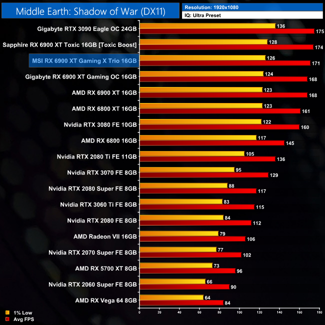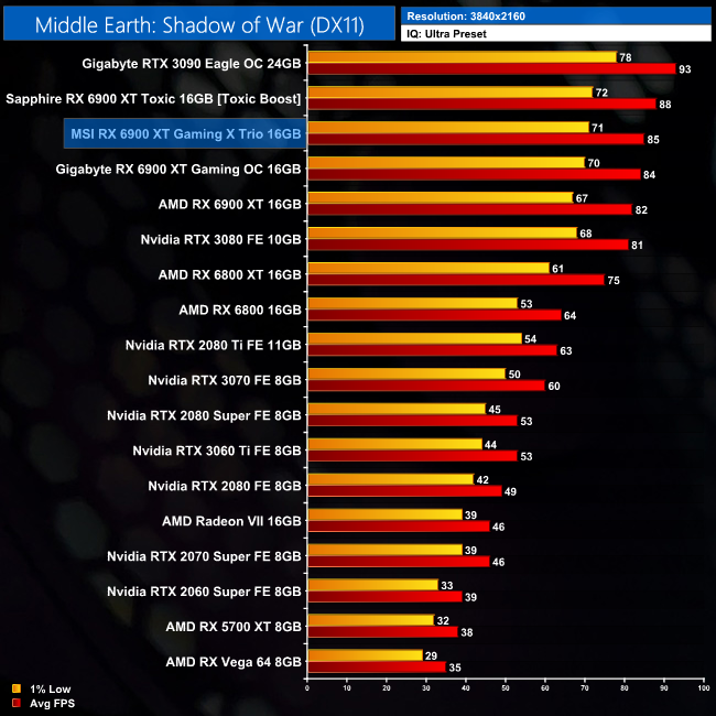 Moving on, we come to Shadow of War. This sees a 4% gain for the Gaming X Trio, compared to AMD's reference card, when testing at 4K, though it is still 9% slower than the RTX 3090 here.
