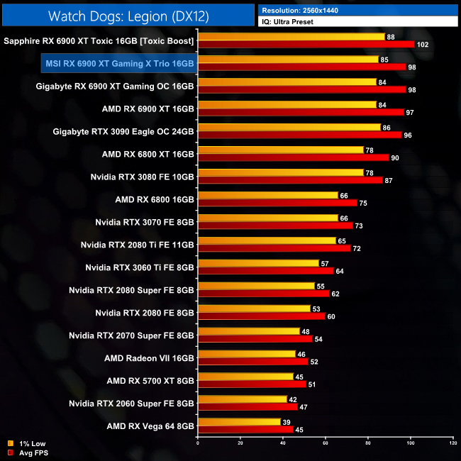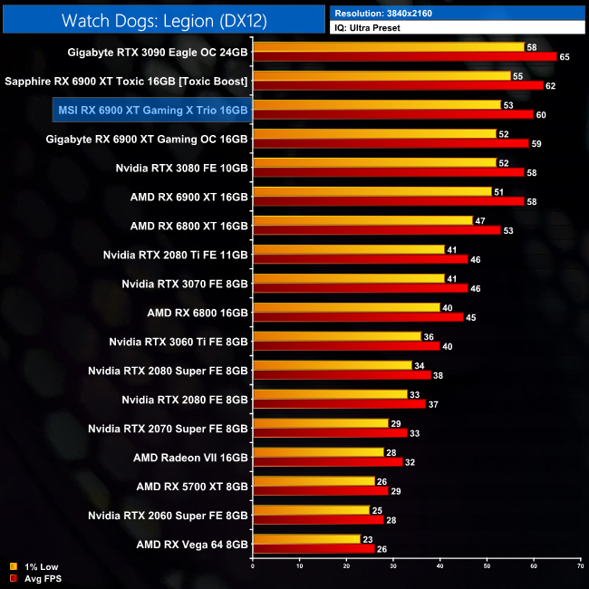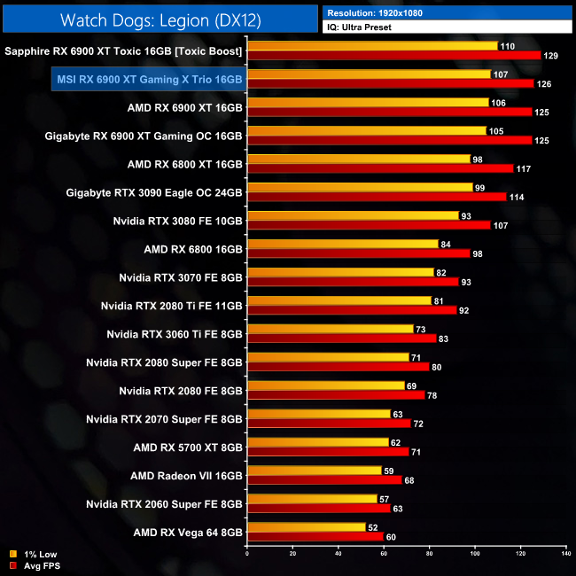 Lastly, we come to Watch Dogs: Legion. Here, the Gaming X Trio stretches to a 3% advantage over the reference card when testing at 4K. It is 8% slower than RTX 3090 at that same resolution.