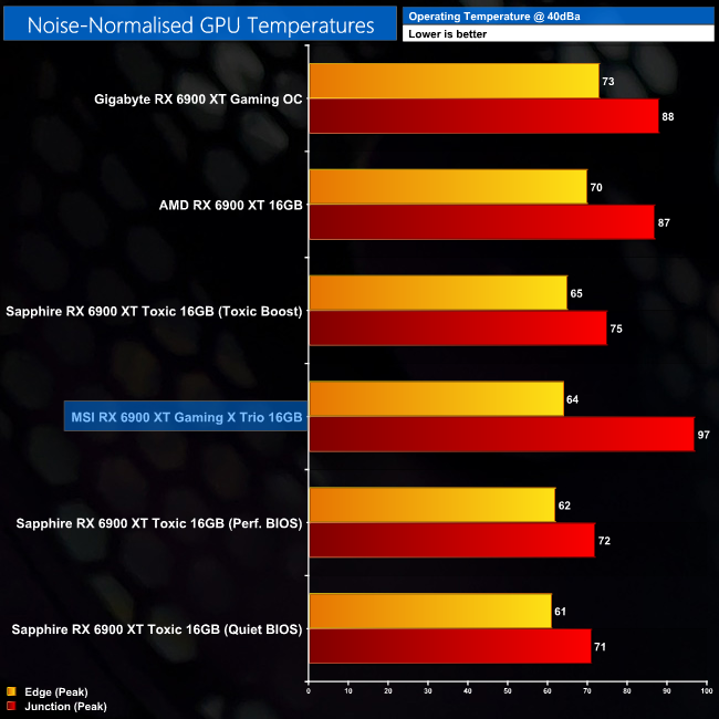 Following on from our stock thermal and acoustic testing, here we re-test the operating temperature of the GPU, but with noise levels normalised to 40dBa. This allows us to measure the efficiency of the overall cooling solution as varying noise levels as a result of more aggressive fan curves are no longer a factor.