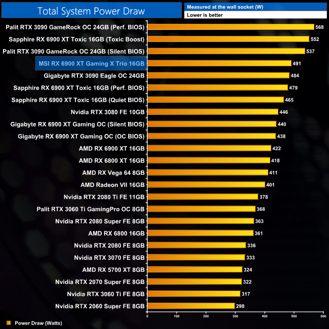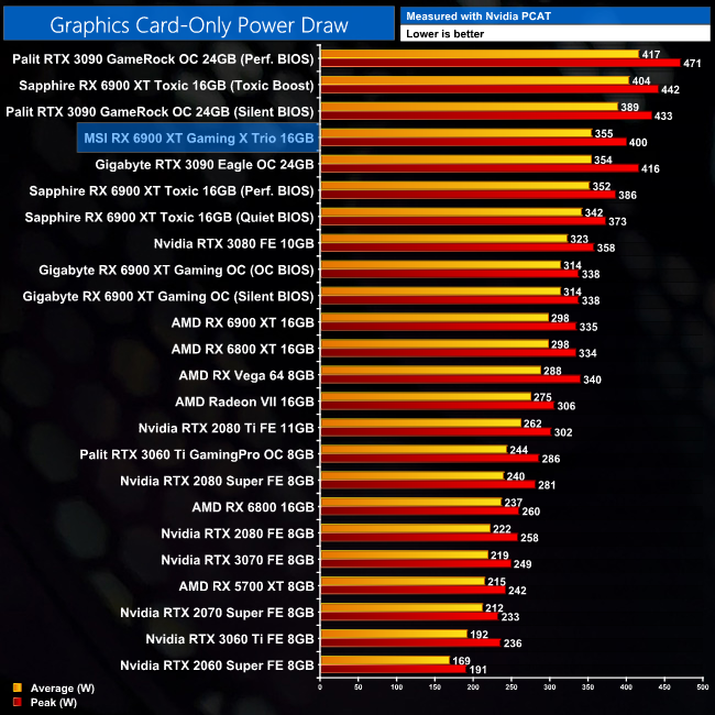 Looking at total board power, MSI has boosted power draw pretty significantly with the Gaming X Trio. My testing shows an average consumption of 355W, almost 60W above the reference card and 40W higher than the Gigabyte Gaming OC.