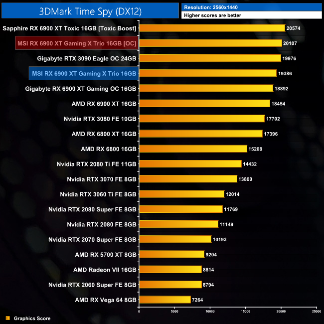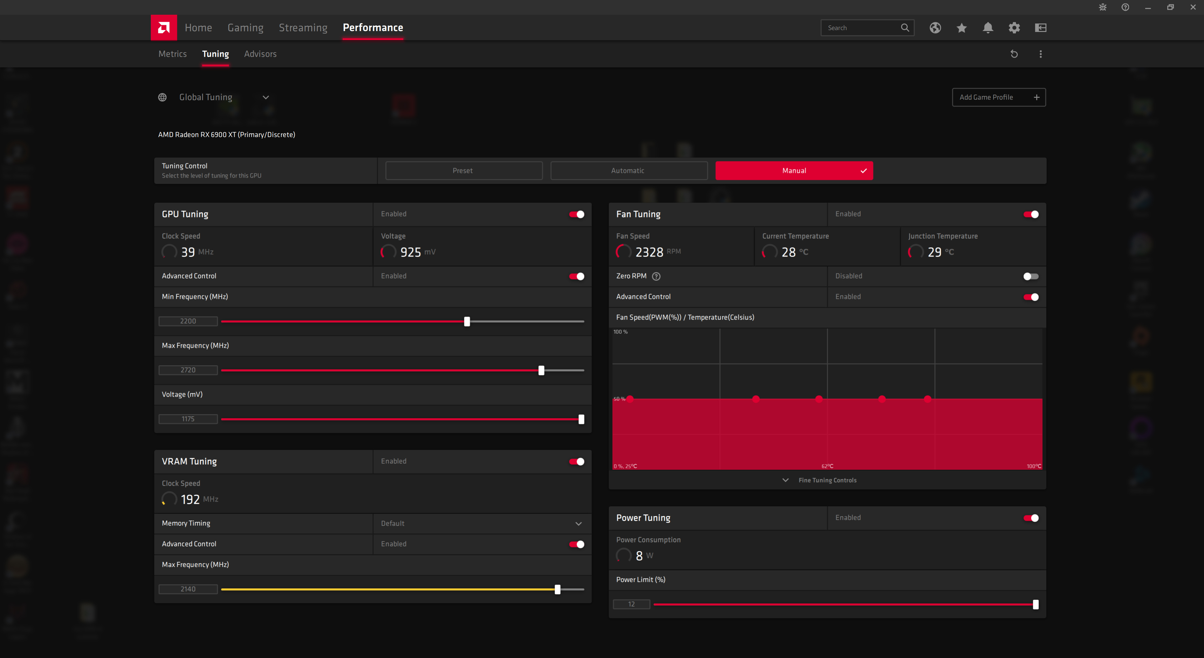 For our manual overclocking, we maximised the power limit (+12%) and set the GPU core to 2720MHz. We set the memory to 2140MHz as any further resulted in performance degradation.