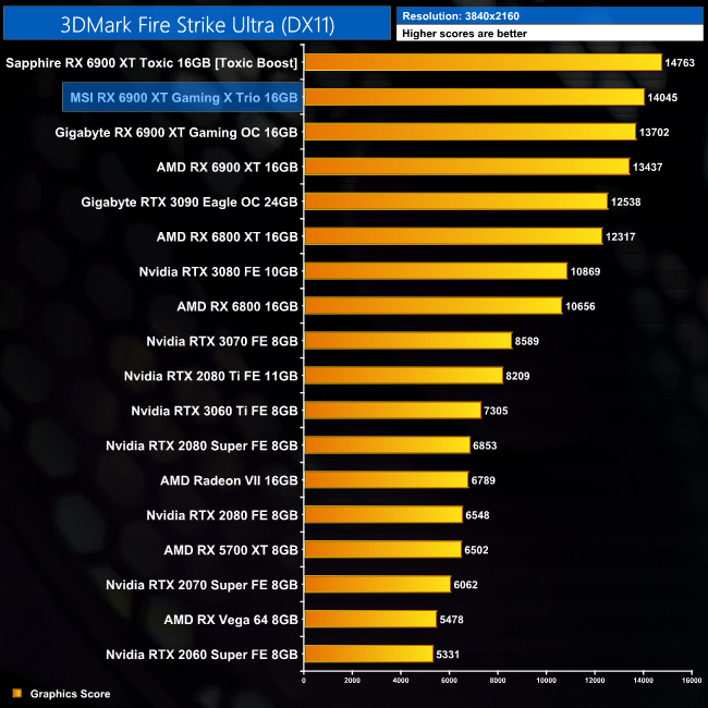 Starting off with 3DMark, we can see some decent results from the Gaming X Trio. Across all three tests, it is 5% faster than the reference card, and only 3% slower than RTX 3090 in Time Spy.