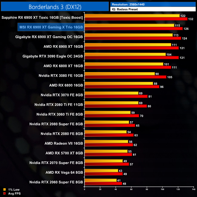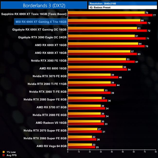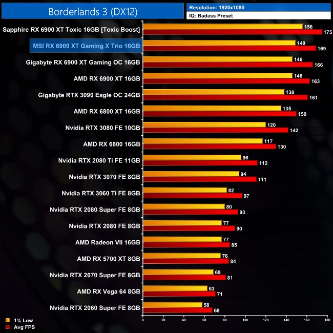Borderlands 3 is an AMD-sponsored game, and here we see the Gaming X Trio pull a single frame ahead of the RTX 3090 at 4K. It is 3% faster than the reference 6900 XT at that same resolution.