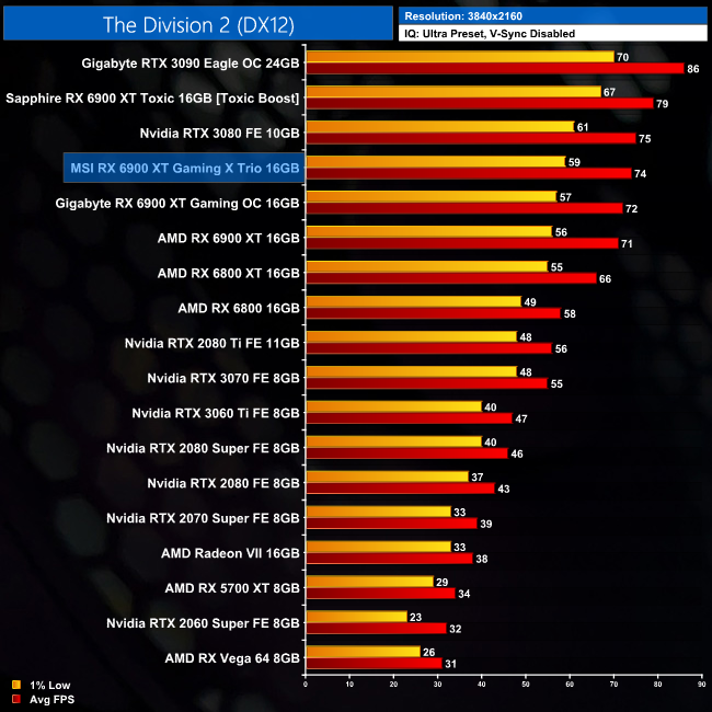 As for The Division 2, the Gaming X Trio comes in 14% slower than the RTX 3090 at 4K. It is, however, still 4% faster than the reference card here.