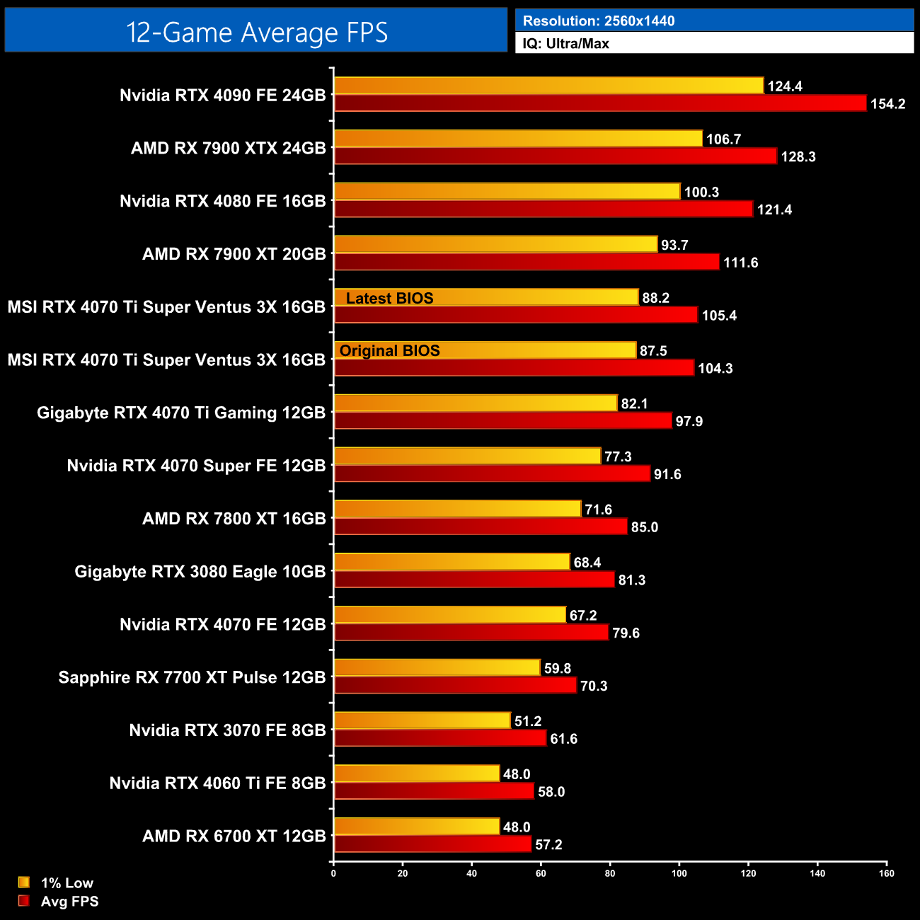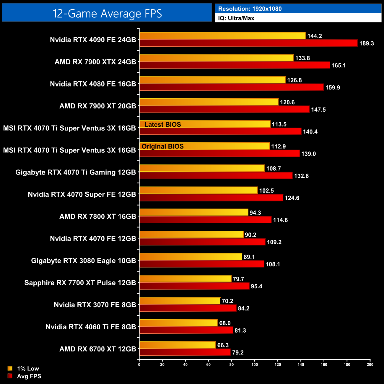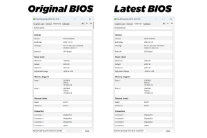 As we can see from the breakdowns, the latest BIOS makes very little difference to frame rates, even compared to the original BIOS that the card shipped with. Performance differences of more than 2% were very uncommon in my testing, with everything else being of basically no statistical importance at all, given almost all of the variation is within margin for error. That's because we saw an average improvement of just 1% across all 12 games, at every resolution tested.