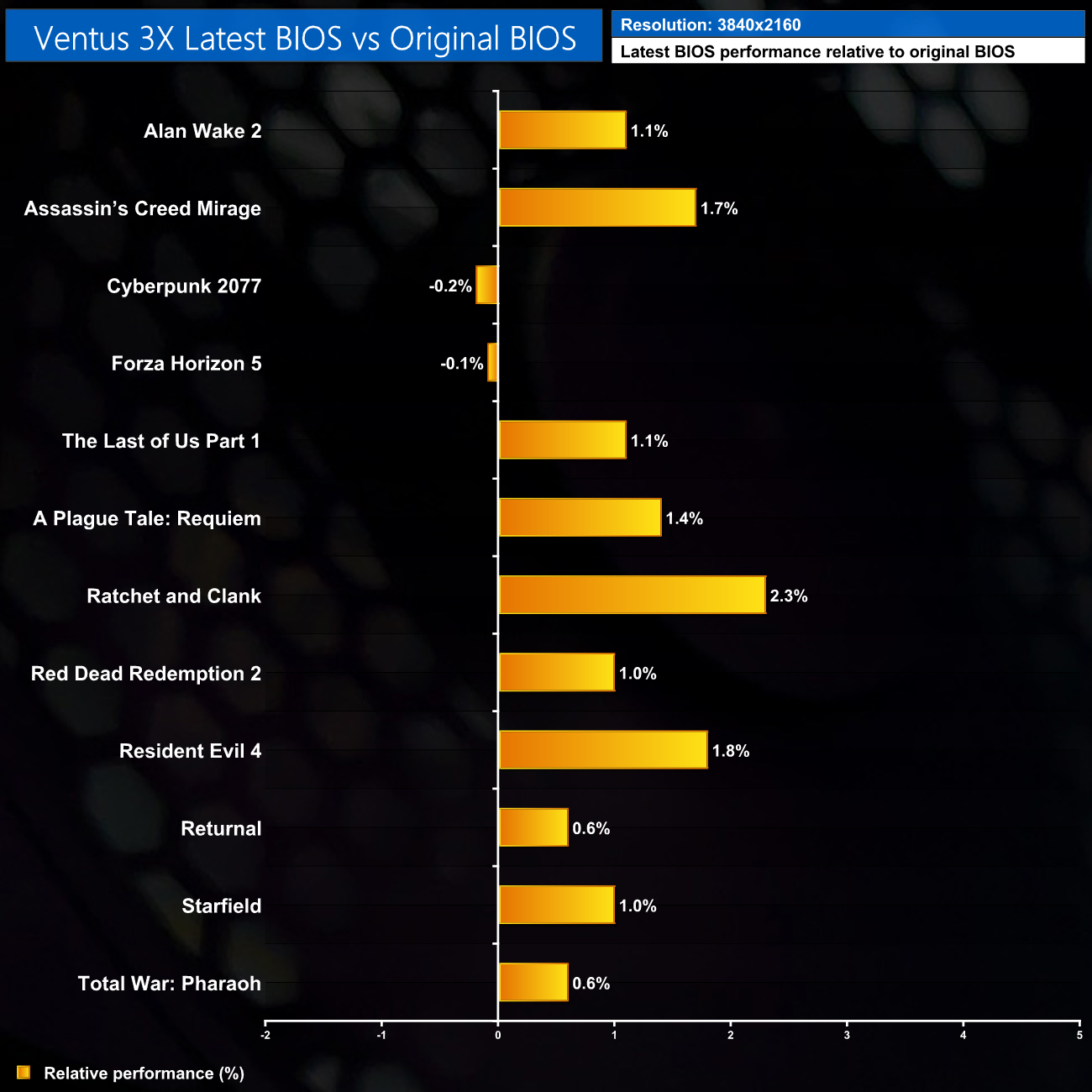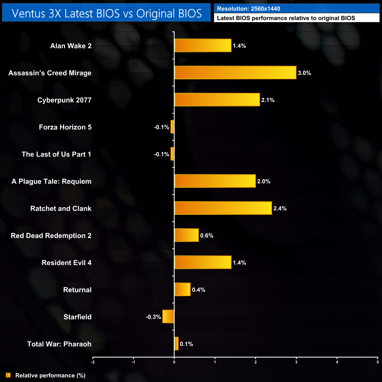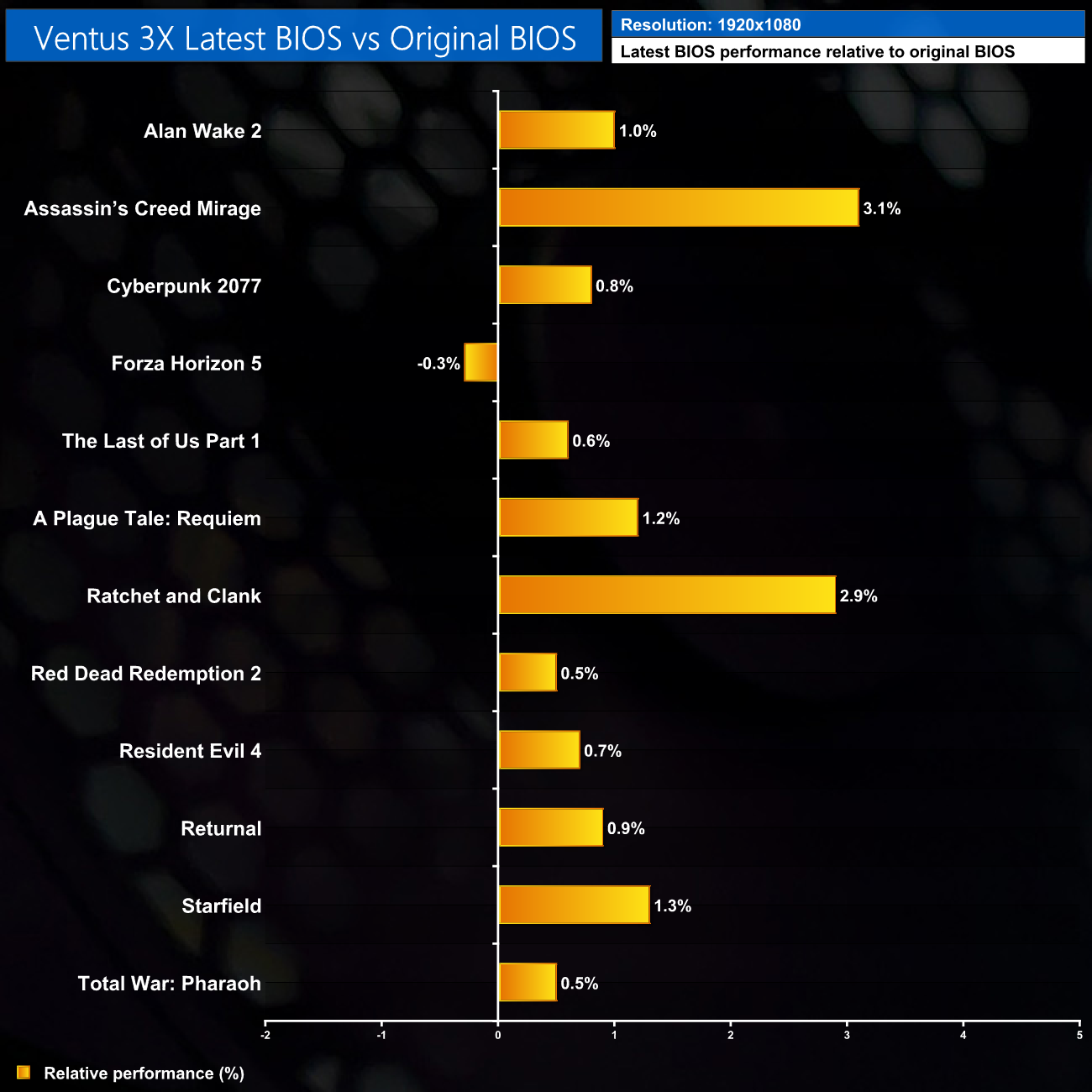As it turns out, the answer is next to none. I saw, at best, a 3% gain using the latest BIOS for the Ventus 3X, and only on three occasions. Even if the gain was 3% on average it wouldn't be much, but almost every game tested showed an even smaller margin of difference, and we averaged just a 1% gain for the new BIOS, over all 12 games tested, at all three resolutions tested.