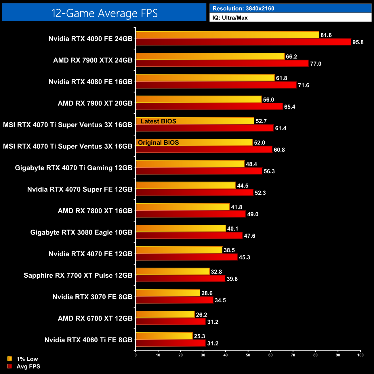Having been unable to re-test the MSI RTX 4070 Ti Super Ventus 3X before our day 1 review went live, it was always my plan to test the card again using the latest BIOS ahead of the upcoming RTX 4080 Super reviews, which will be out next week. While doing so, I figured I may as well present the data in a quick-and-dirty fashion, so we can see exactly what difference was made by updating to the latest BIOS version.
