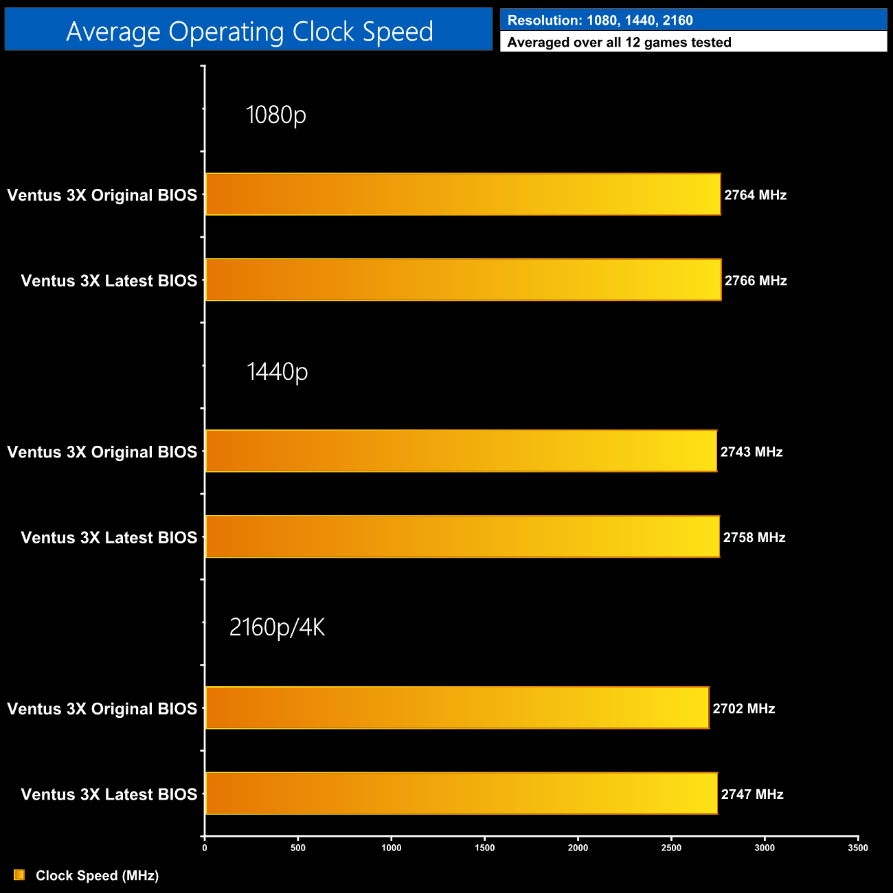 Once more, we are looking at next to no difference with the latest BIOS. The average clock speed we observed between the two BIOS versions is almost identical at 1080p and still less than a 2% difference at 4K.
